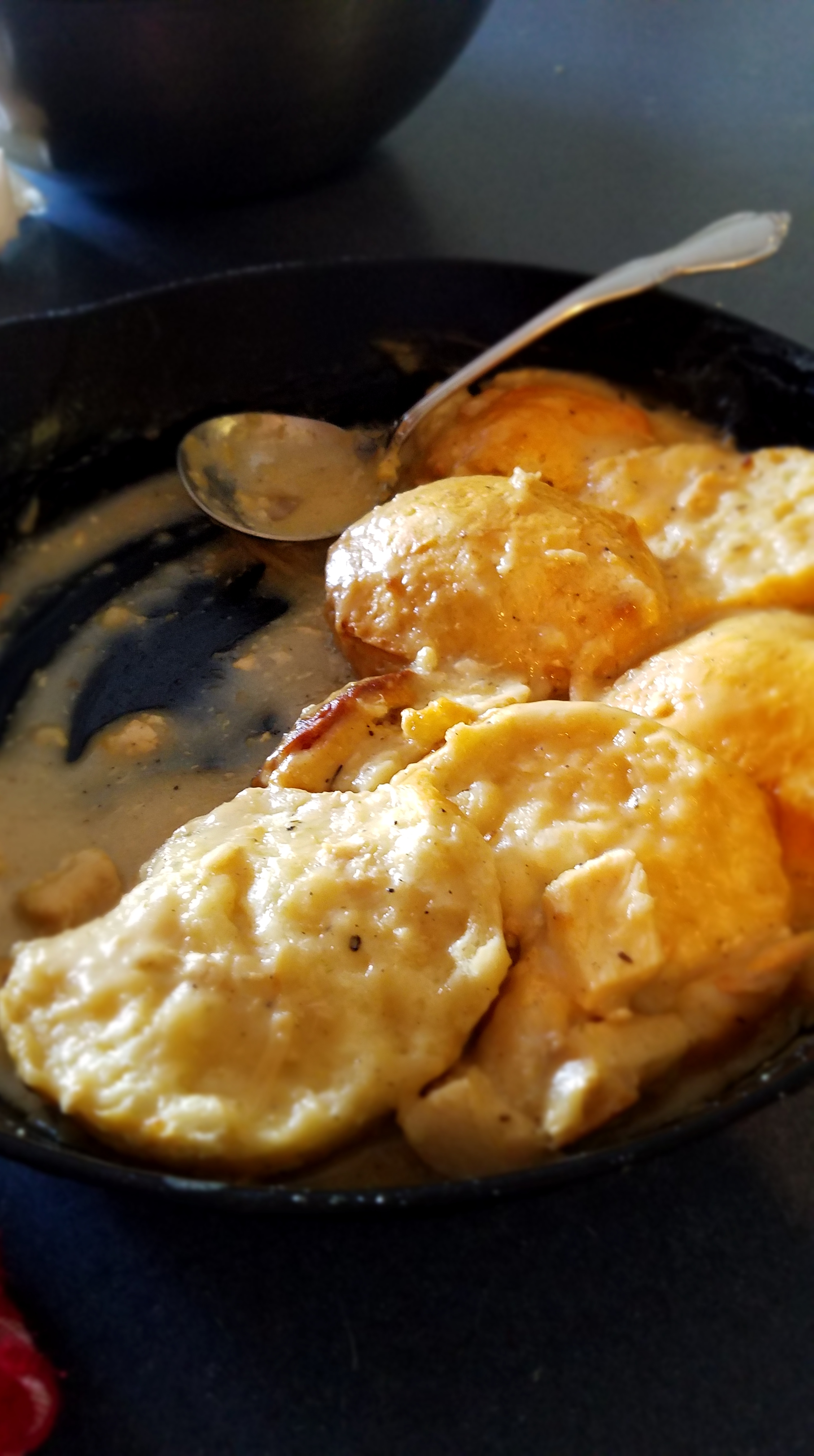 Add the chunks of chicken to the pan and mix with the gravy. Split the biscuits in half and pack them tightly together on top of the chicken and gravy. Dab some gravy on top of the biscuits, to prevent them from burning. Heat in a 350° oven for 10 to 15 minutes.