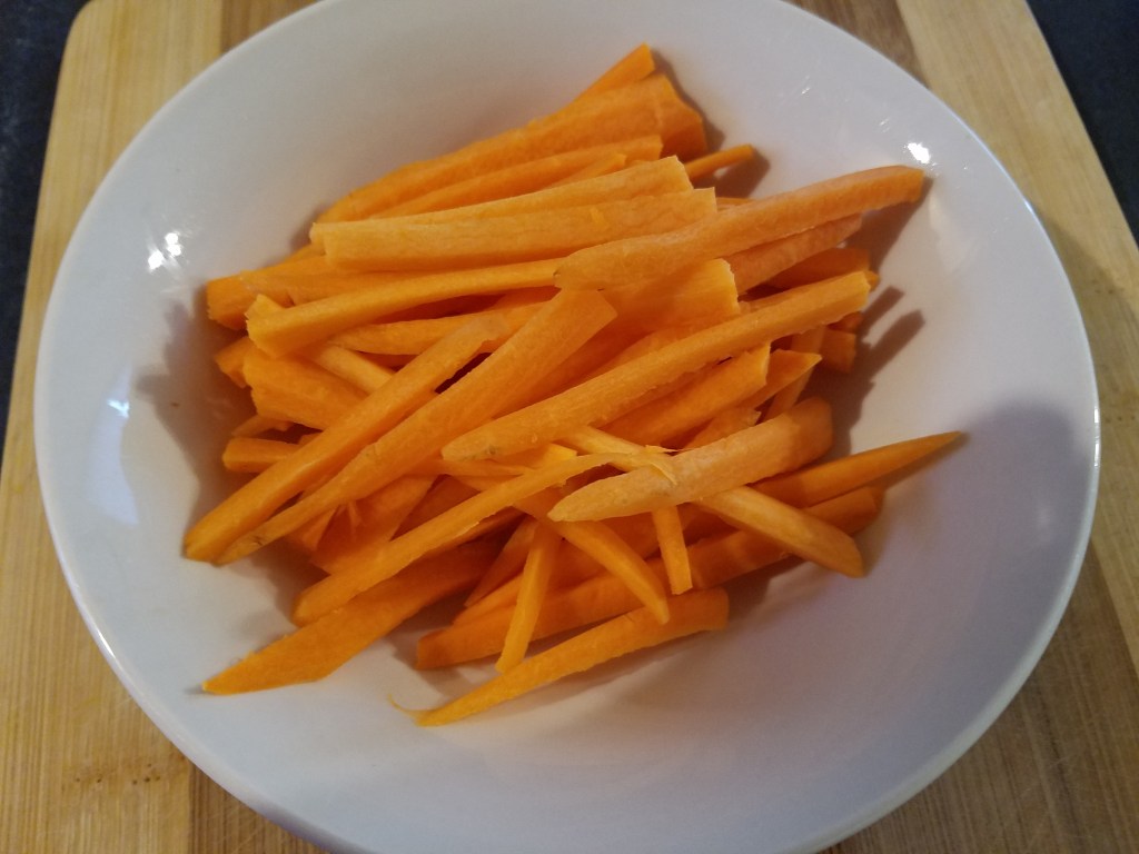 Cut the vegetables. I went for long and slender pieces this time so that meant julienne cuts on the onion and jalapeño and match stick cuts for the carrots. Set the vegetables aside.