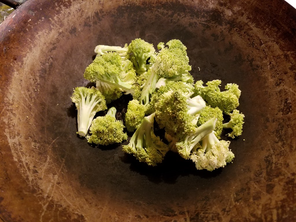 Add the broccoli pieces to the wok. Set heat to low and stir-fry briefly.