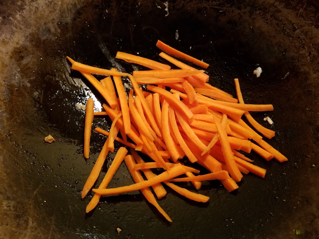 Add a tablespoon of oil to the hot wok and add the sliced ginger and a little bit of green onion. Stir for a moment and then add the carrots and jalapeños. Stir for a minute, to allow the carrots to soften.