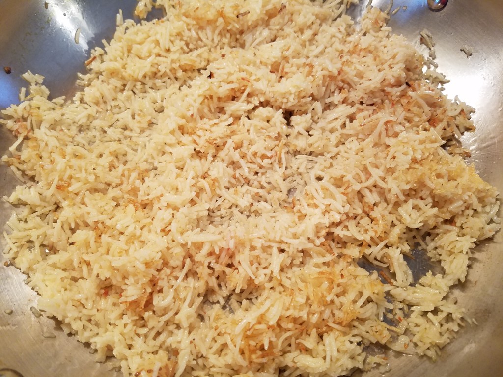 Turn the rice over after about 5 minutes and crisp the other side. The rice should turn light brown. Turn the heat off after 4 or 5 minutes. Keep the rice on the stove top while the vegetables are cooked.