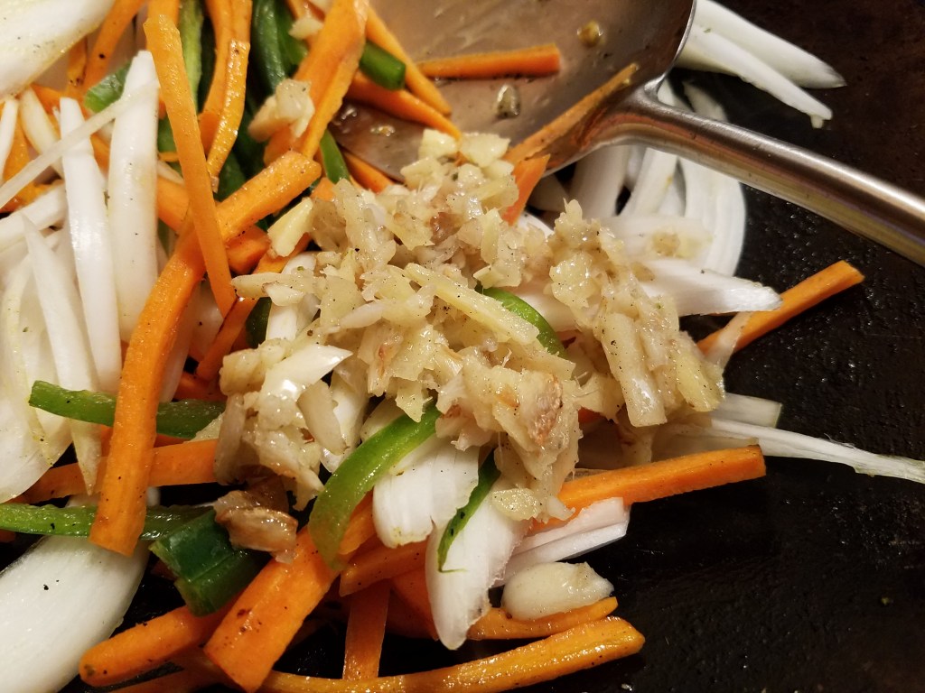 Add the carrots to the wok and turn the heat up to medium. Stir fry for a few minutes and then add the onion and jalapeño. Chop some of the cooked ginger and garlic and add it the wok. I added about 2 tablespoons of ginger and garlic. Add the broccoli and stir briefly.