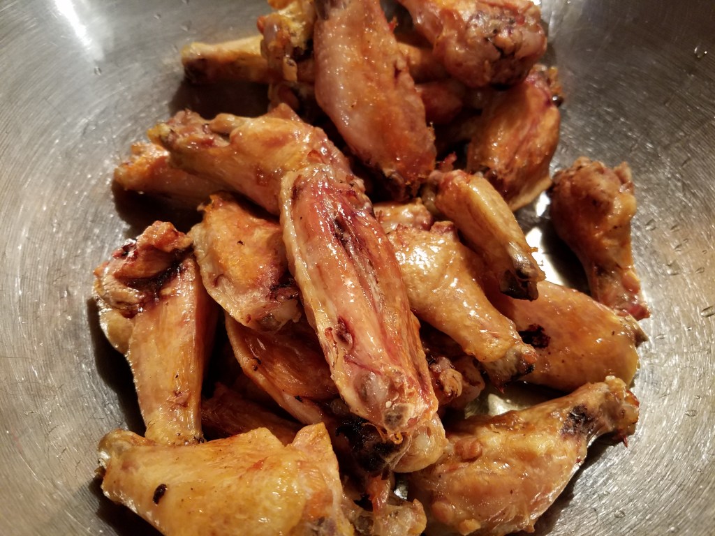 Rinse the chicken wings in cold, clean water. Allow the wings to air dry for about 20 minutes. Pat them dry with a paper towel and place them on a parchment paper covered backing tray. Bake at 400° for 30 minutes and then turn them over to brown on the other side. Turn the oven down to 350° and bake for another 30 minutes, or until the skin on the wings have crisped.