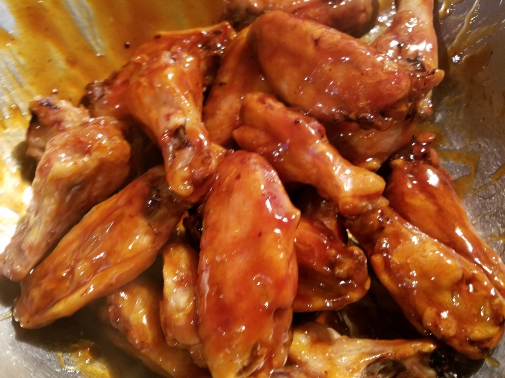 Pull the wings from the oven and add them to a large mixing bowl. Pour the Asian sauce over the wings and toss to coat. Add the wings to a serving platter.
