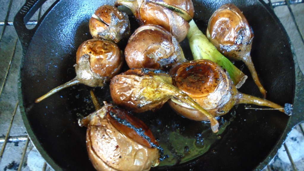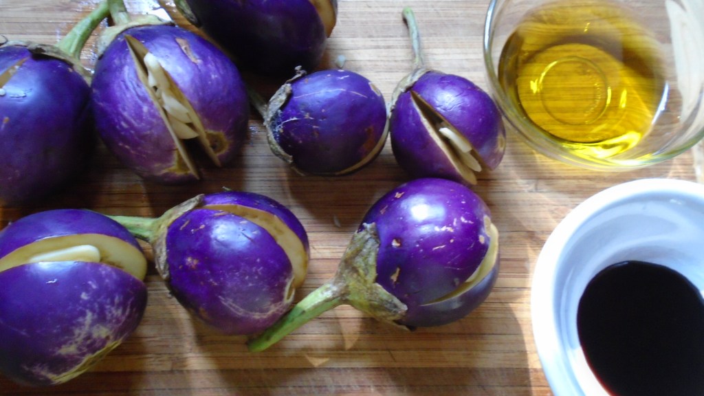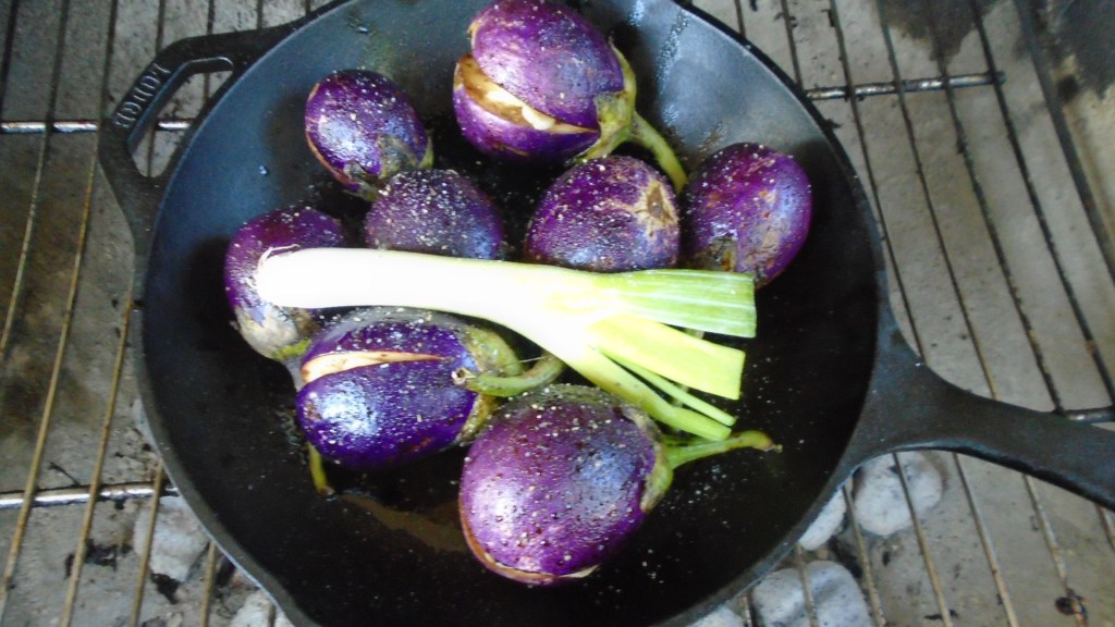 Bake on a hot grill (400°) for 30 to 45 minutes. The temperature of the coals will diminish during the grilling process but that’s ok. Cover the eggplants, if necessary to steam and soften them but finish by uncovering them.