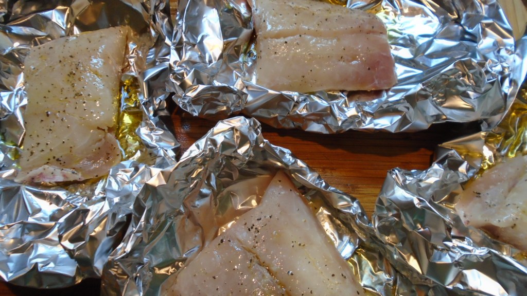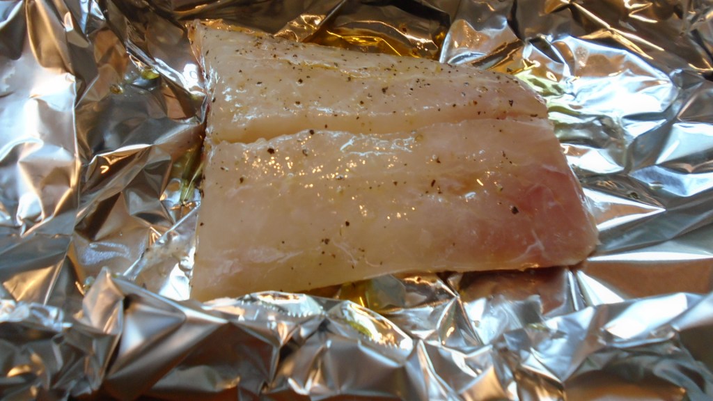 Place a tablespoon of olive oil in the tray and smear both sides of the fish in the oil. Lay the fish on the foil, skin side down.