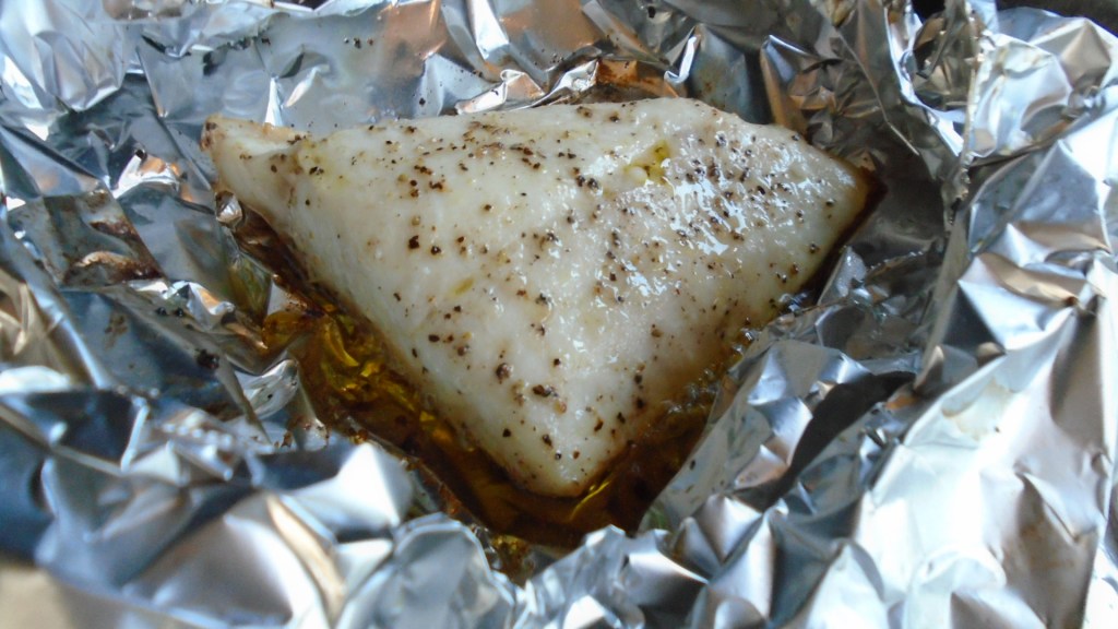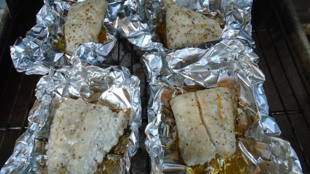 Grill for about 10 minutes over medium to high heat. The fish is done when it becomes firm to the touch and you start to see the oils in the fish sizzling on the foil.