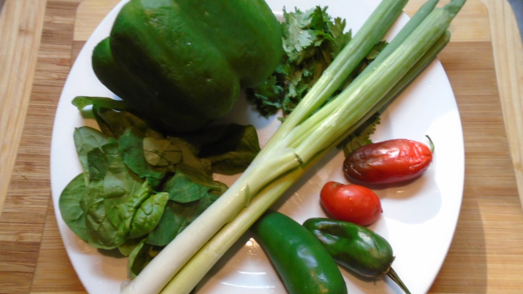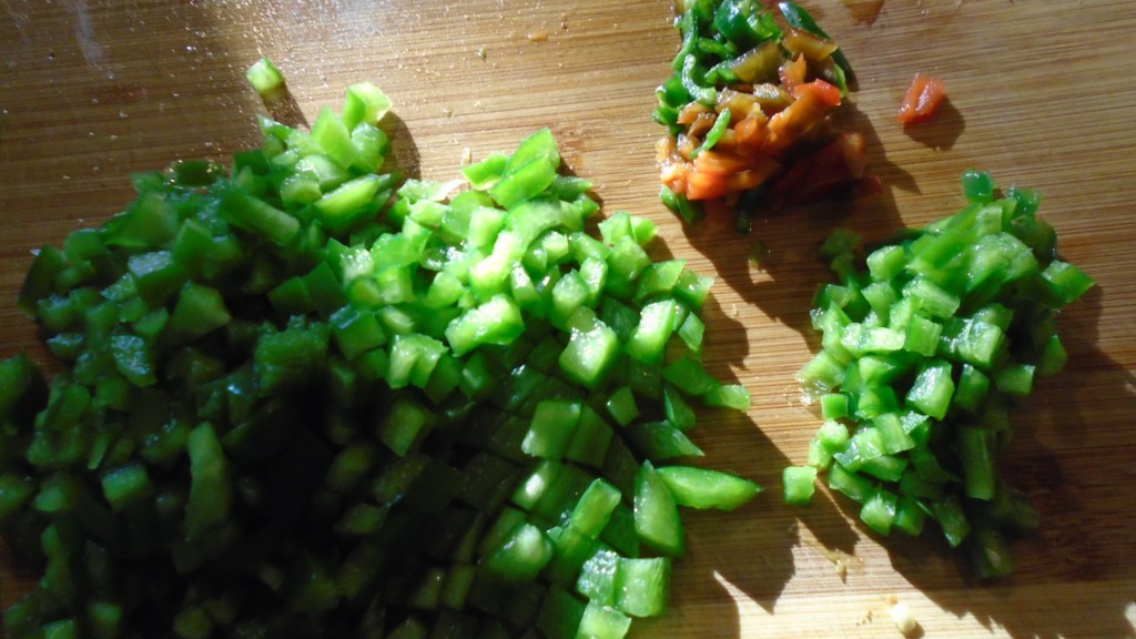 While the tomatoes cook, chop the bell pepper, jalapeño and other chiles. Set these aside, for now.