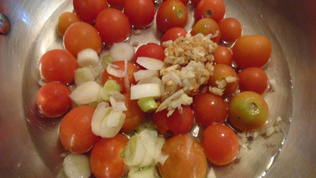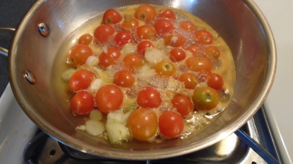 Add the cherry tomatoes to a large skillet. Set the heat low/medium. Add about ¼ cup of water to the pan. Top the tomatoes with one chopped green onion and garlic.