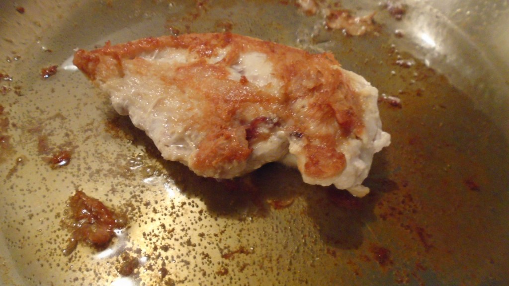 Add a few tablespoons of oil to the pan and set the heat to medium. Add the chicken breast and brown on both sides. Once the chicken develops a crispy exterior, remove the chicken to a paper towel lined plate.