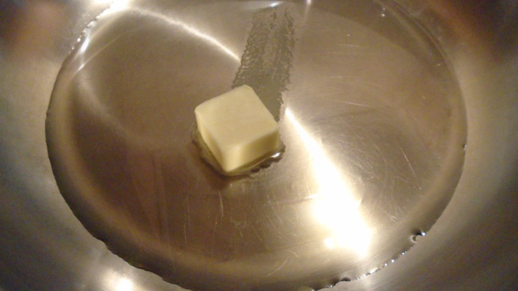 Add a tablespoon of oil and a tablespoon of butter to the pan. Set heat to medium/low.