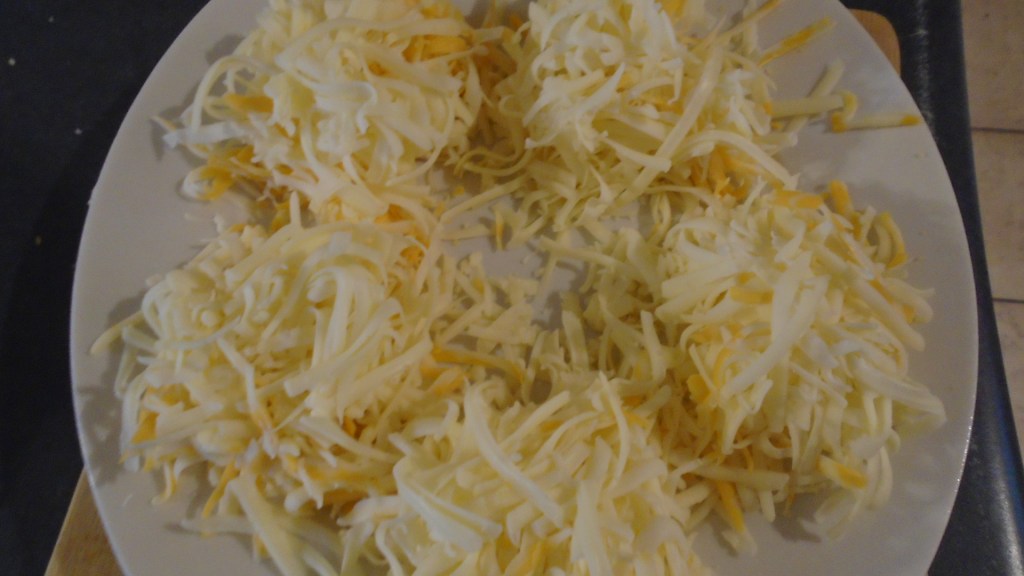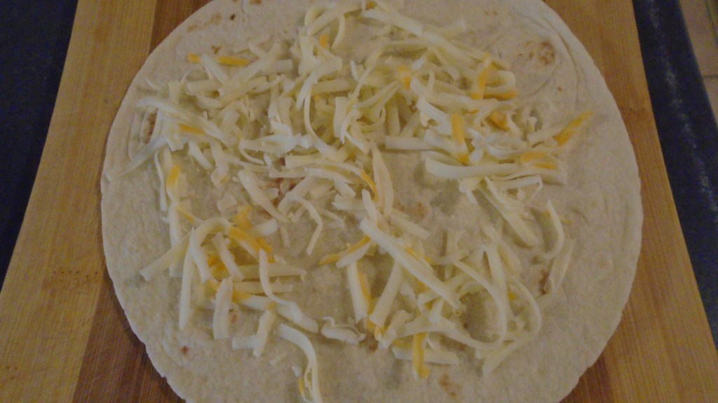 Lay a tortilla on a work surface and add scatter some cheese evenly across it.