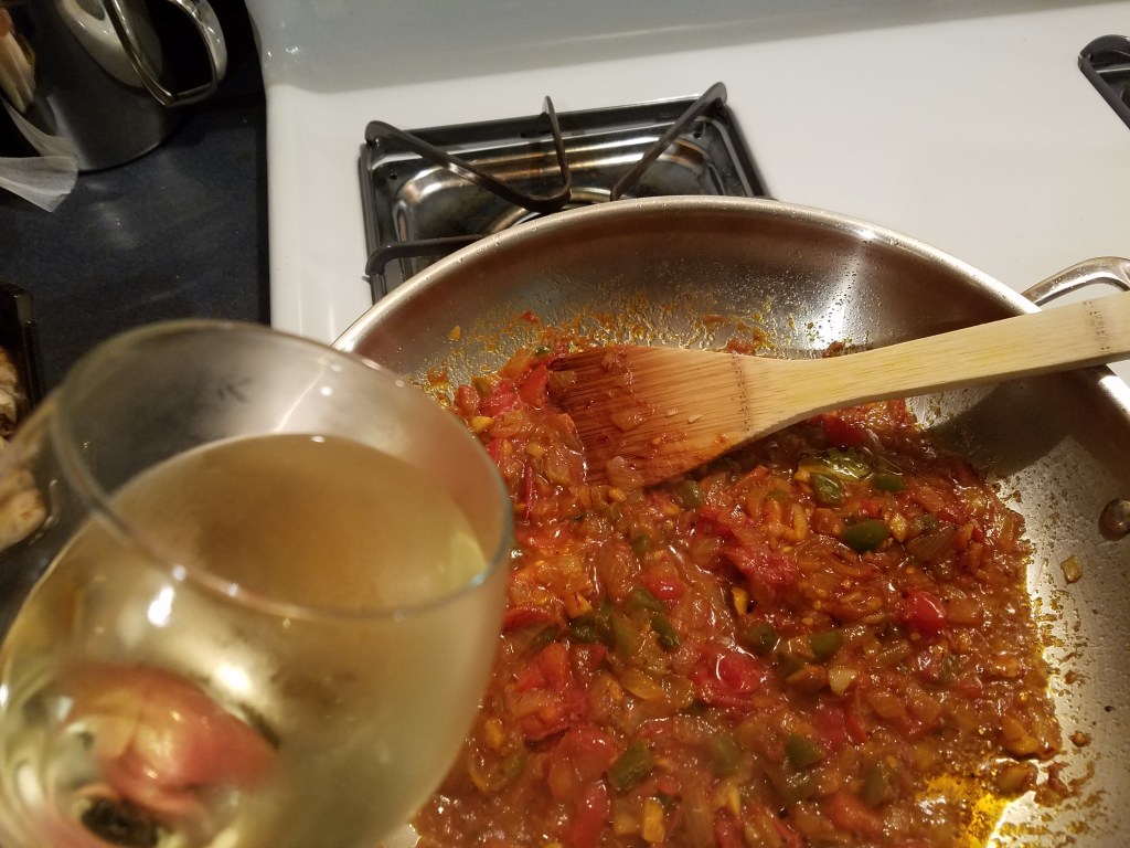 OK. Herbs and spices are in the pot. Good. Now, let it go at medium/low heat for another 10 minutes. Step up the stirring to once per minutes, otherwise the thick sauce will sputter and splatter and get all over my stovetop!