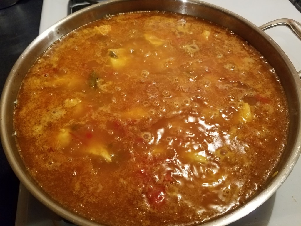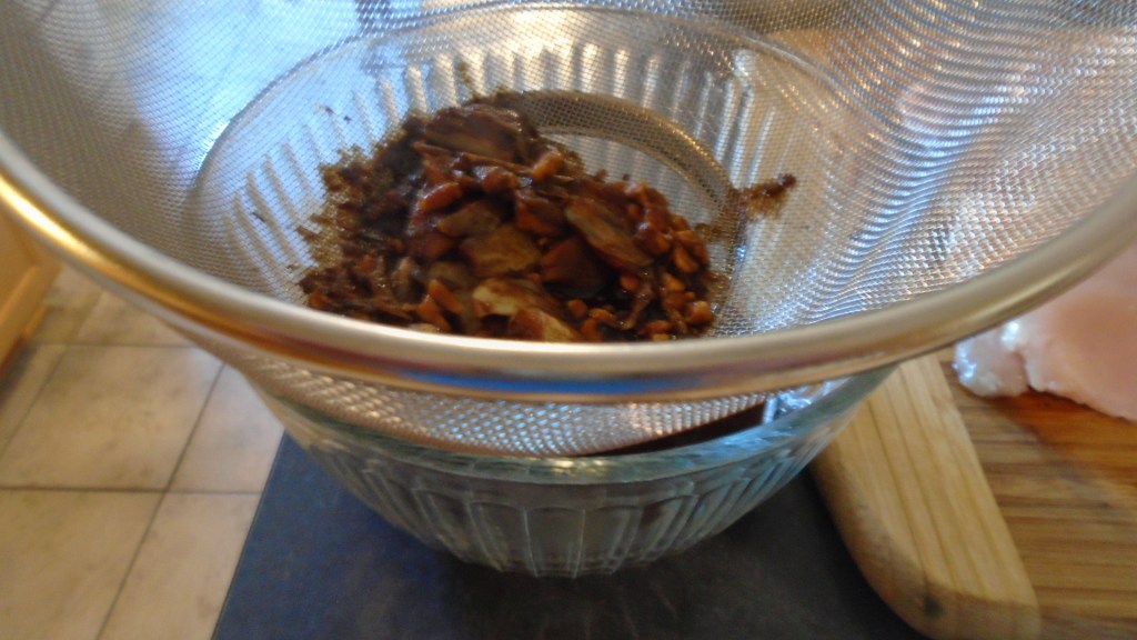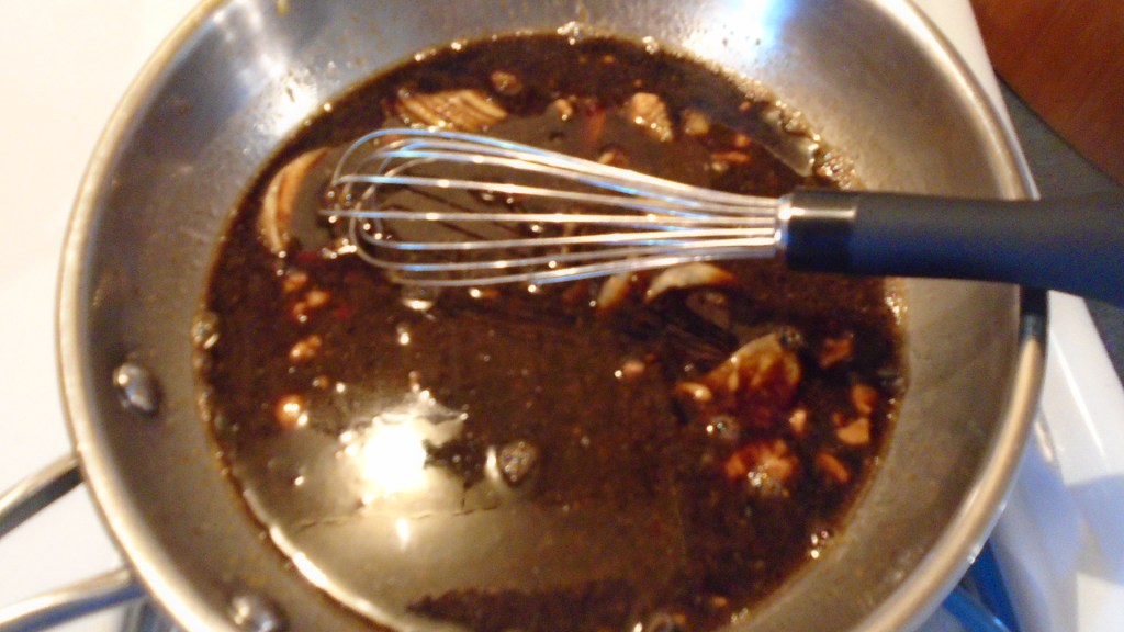 Stir the sauce again. It’s been simmering for about 15 minutes and it looks thick now. I think I can take it off the heat and put in a bowl.