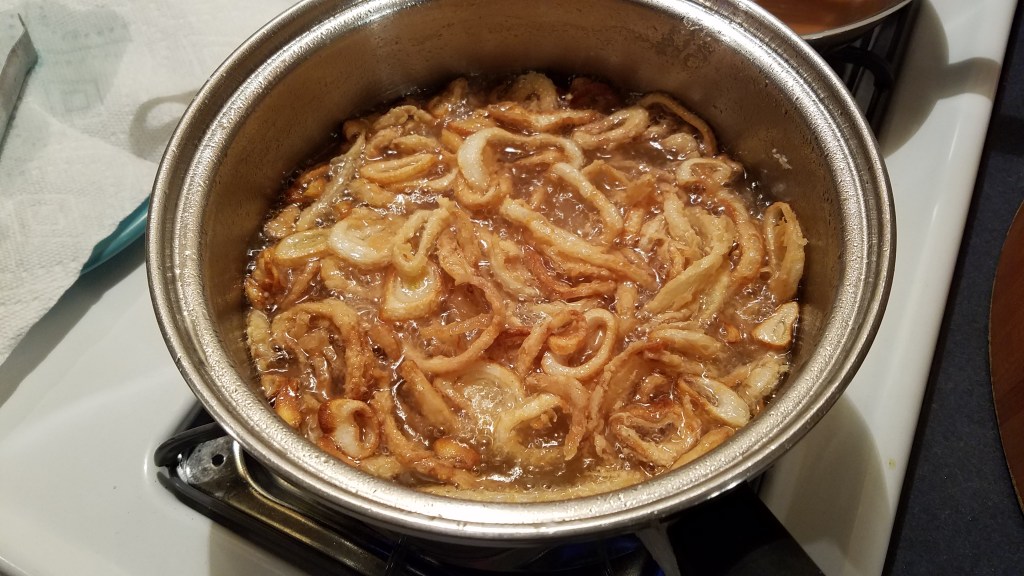 Add the onions to the oil and fry until golden brown and crispy. Remove to a paper towel-lined platter and keep warm.