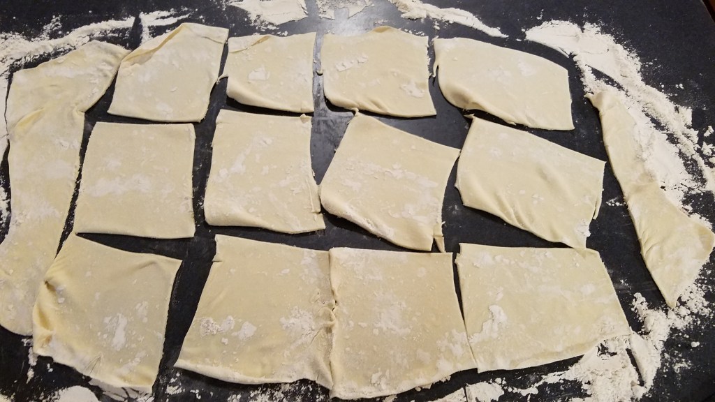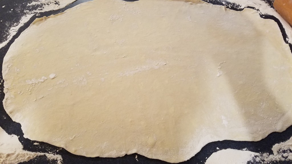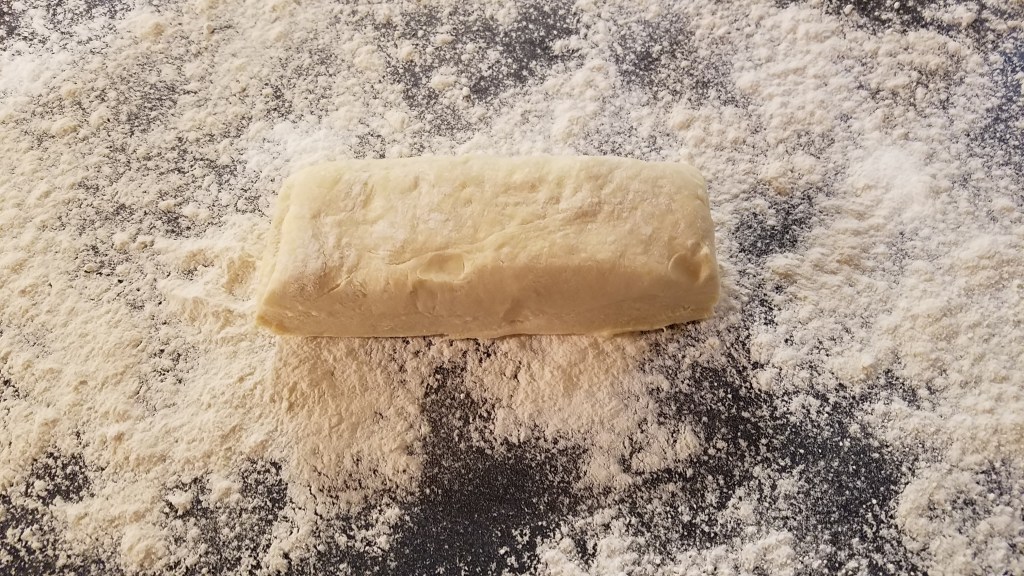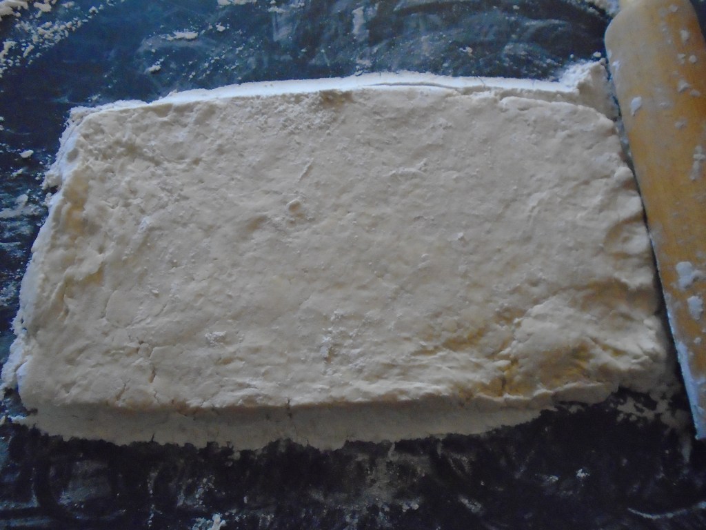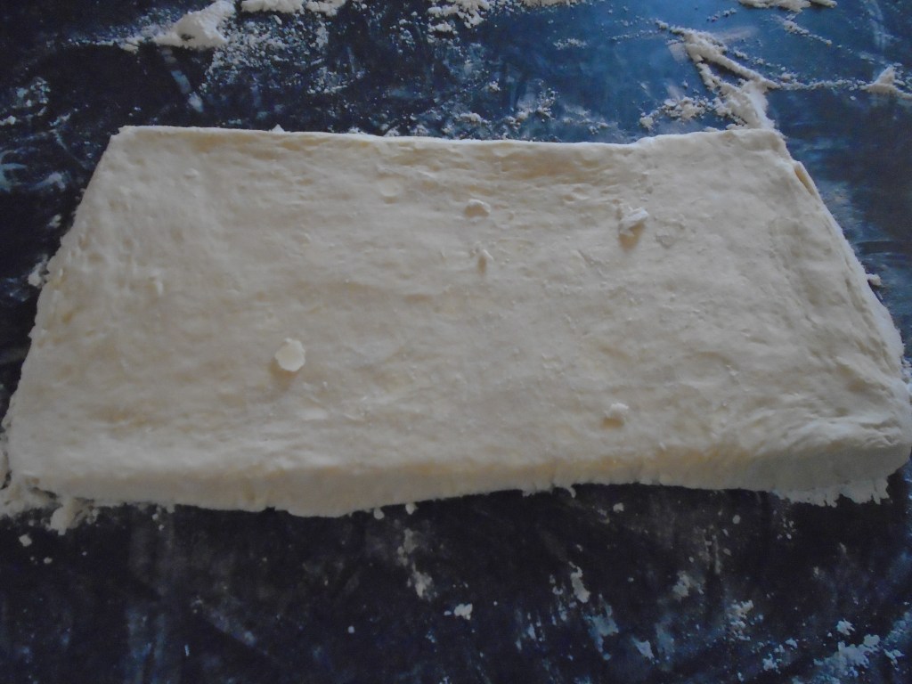 I folded the dough over into a tri-fold and squared the dough by pushing the edges with the rolling pin. I added a little more flour to the work surface to keep the dough from sticking to the surface.
