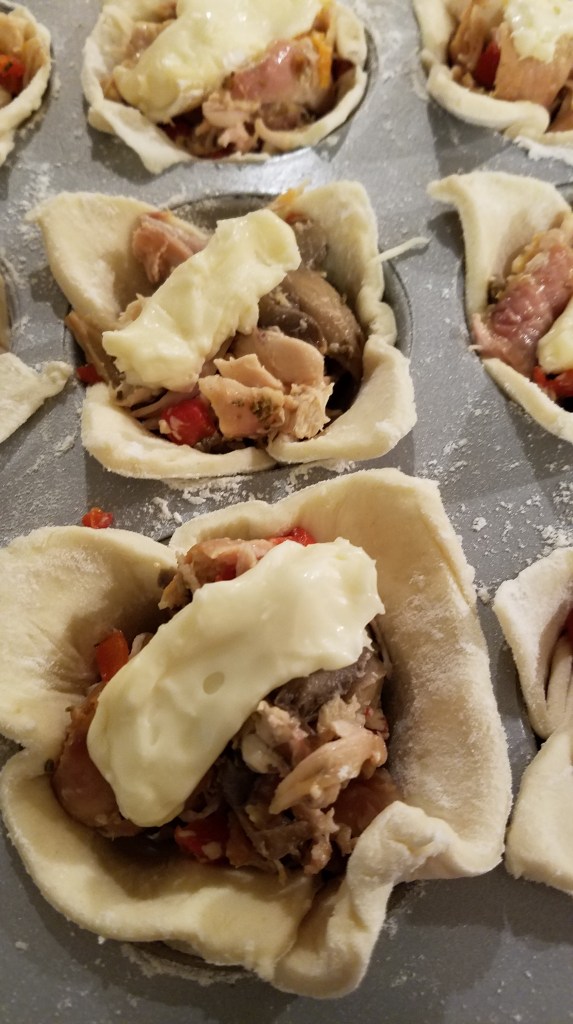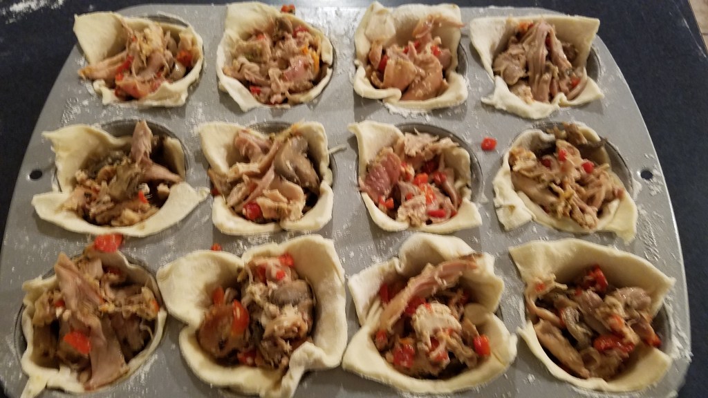 Remove the pastry from the refrigerator and place on a clean work surface. Divide the dough in half. Use one half for the chicken dish and reserve the other half for a dessert dish. Roll the dough out to about ¼” thick. Slice the pastry into 4” squares. Form fit the pastry into the muffin pan.