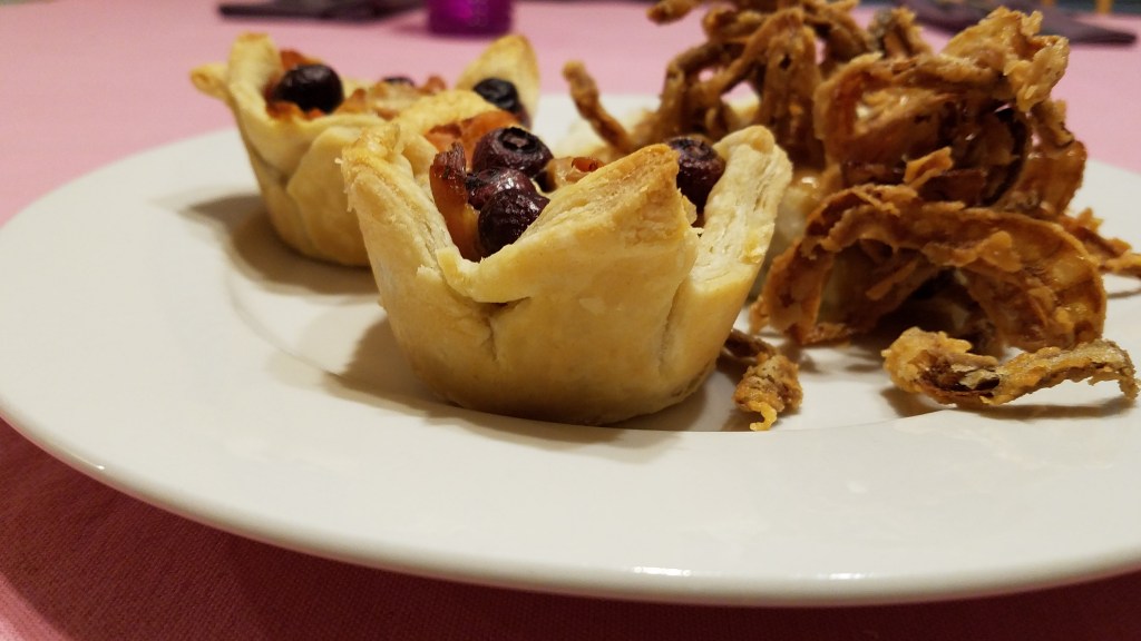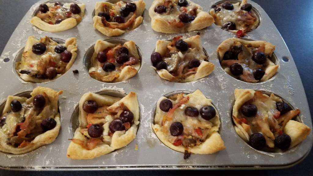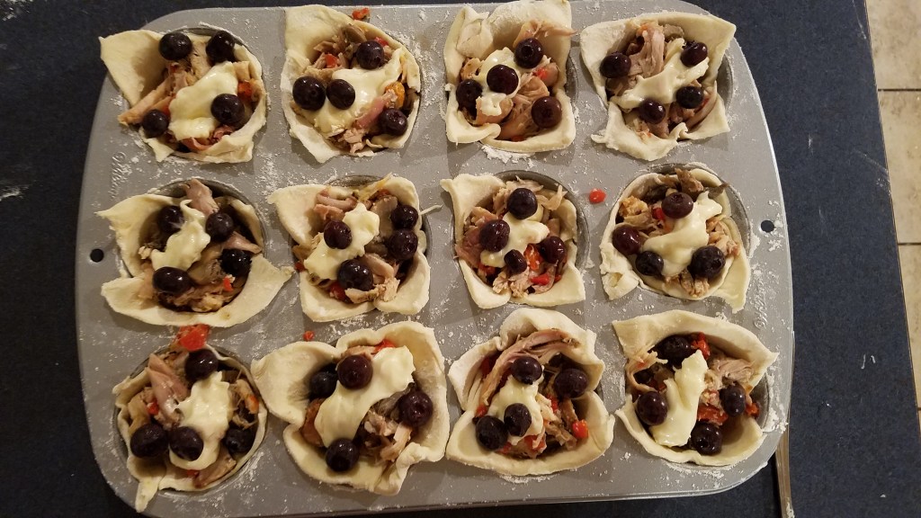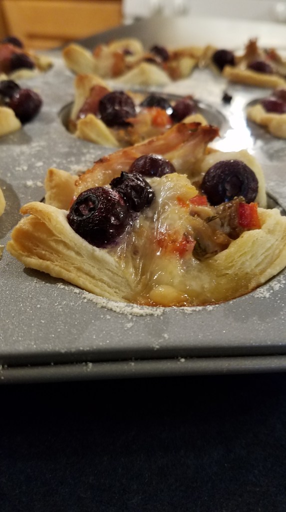 Place the squares in muffing pan and fill the pastry with the chicken mixture. Top with a teaspoon of Camembert cheese and a 3 or 4 blueberries.