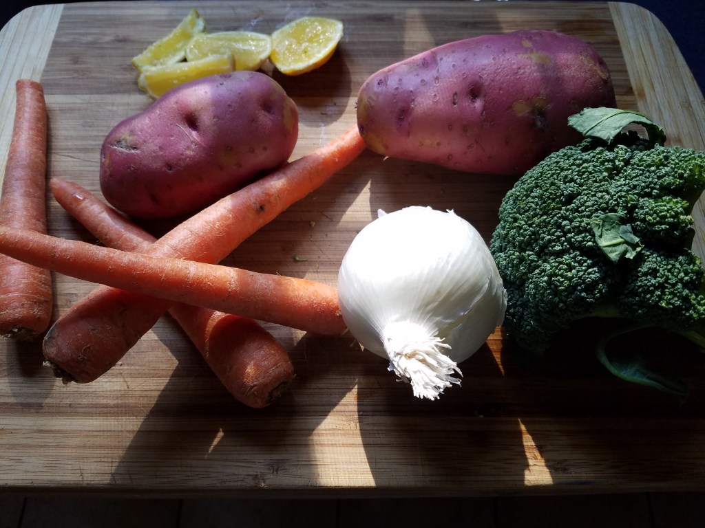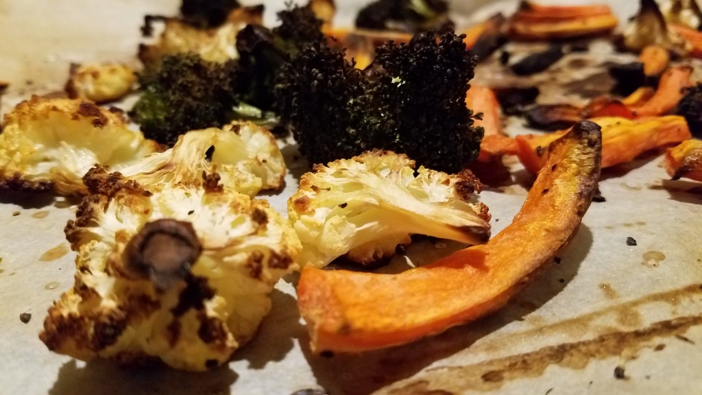 Toss carrots, broccoli and cauliflower in olive oil. Spread the vegetables out on parchment lined backing tray. Roast in the oven at 350° for 30 minutes. Remove and keep warm.