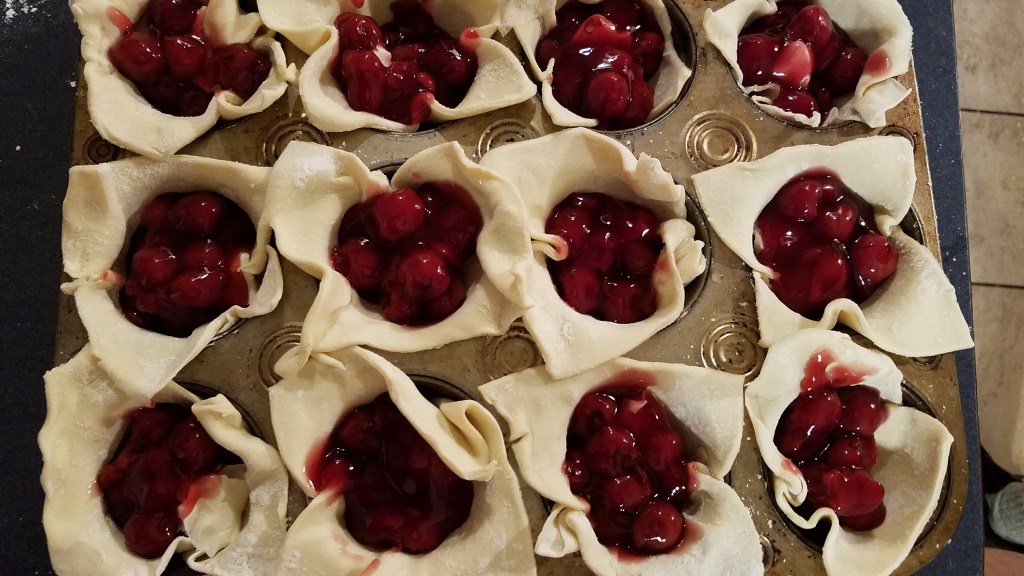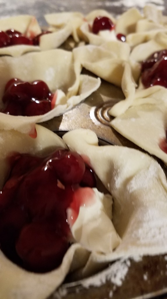 Assemble 12 pastry cups using the same method as before. Fill each one with 2 teaspoons of cream cheese and top with cherry pie filling. Bake at 400° for about 20 minutes, or until the pastry puffs and turns golden brown.