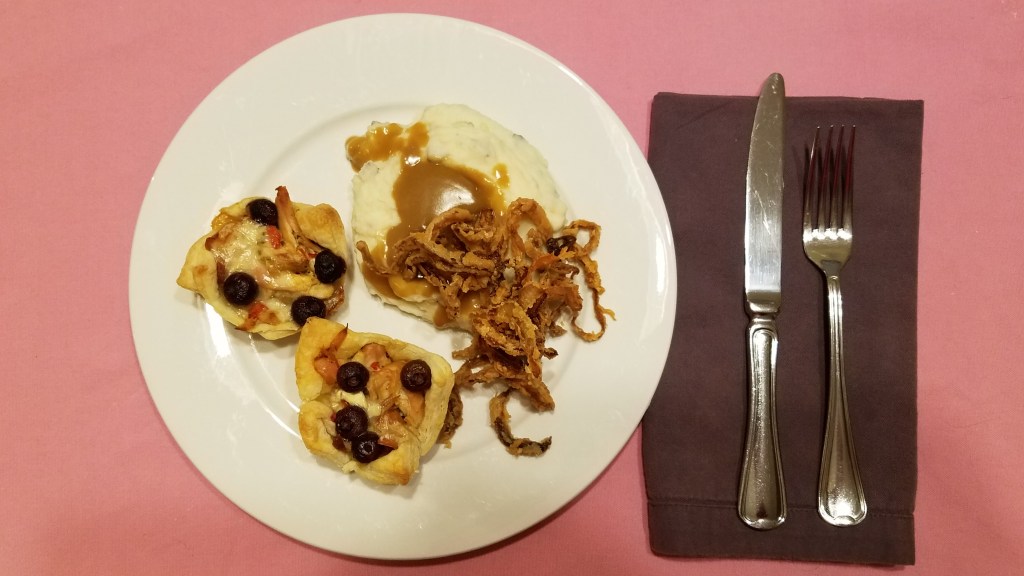 Serve two stuffed pastry shells with mashed potatoes, topped with turkey gravy and fried onions.