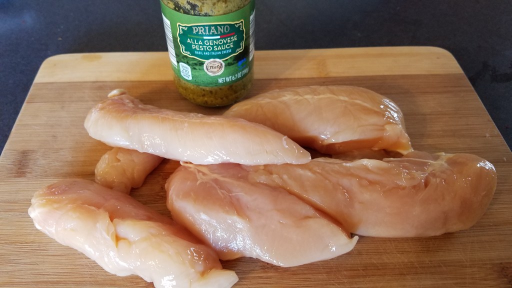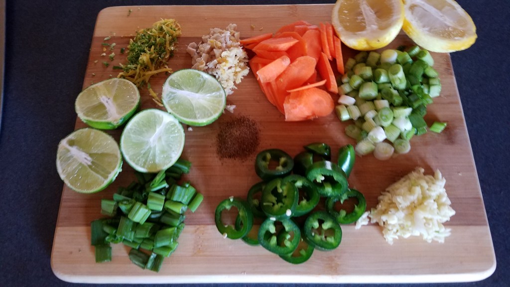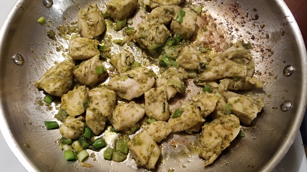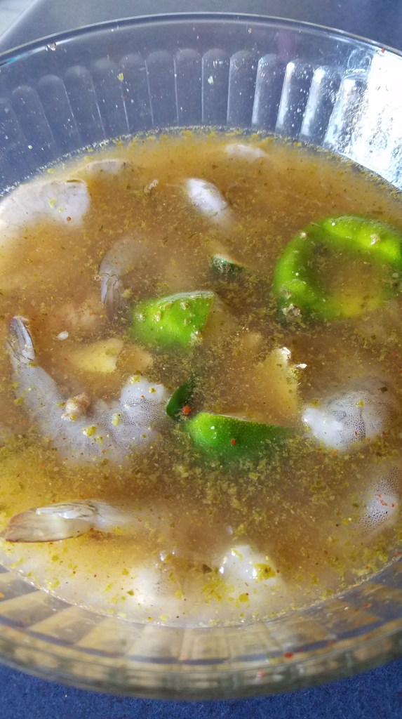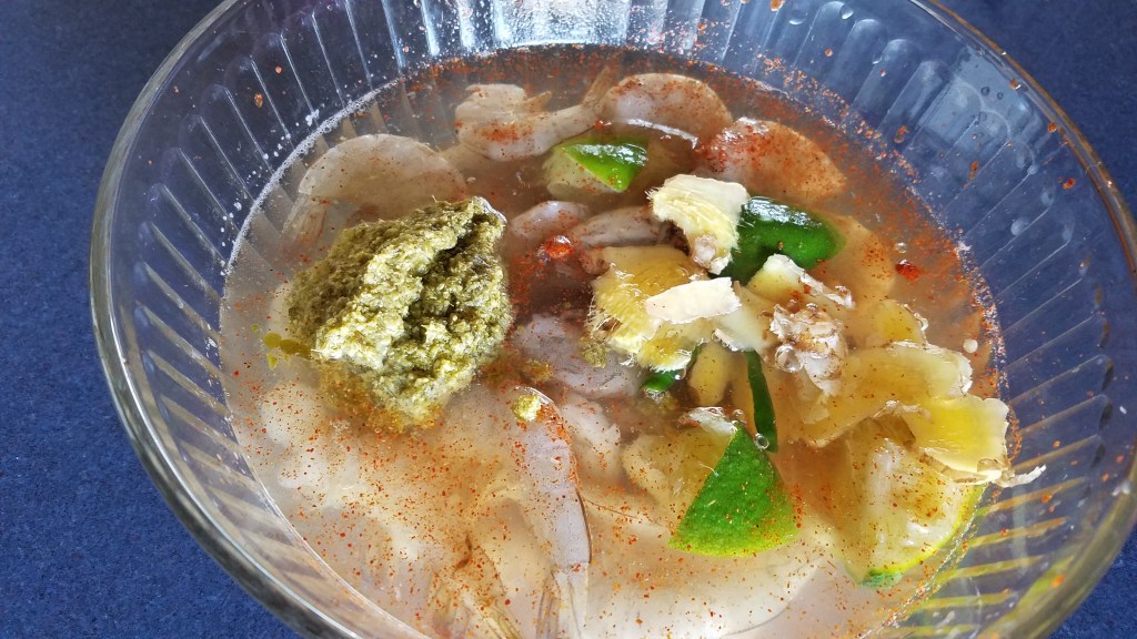 Put the shrimp in a large bowl. Add just enough water to cover the shrimp. Add the pesto sauce, chili powder and minced ginger. Quarter the lime and squeeze the juice over the bowl. Add the rest of the lime to the bowl. Marinate for at least 30 minutes. Since I started with frozen shrimp, I marinated for one hour.