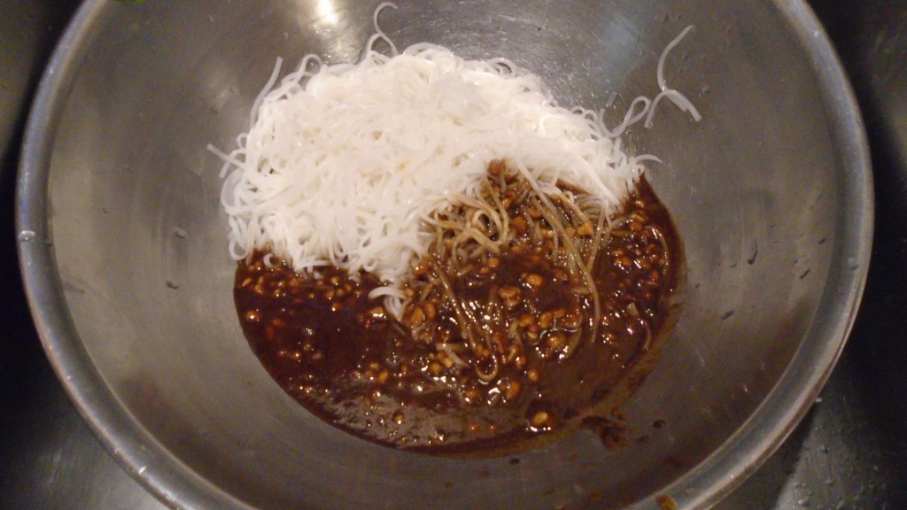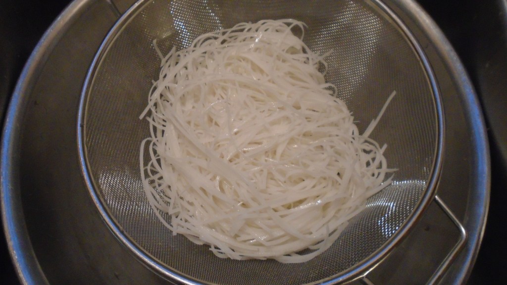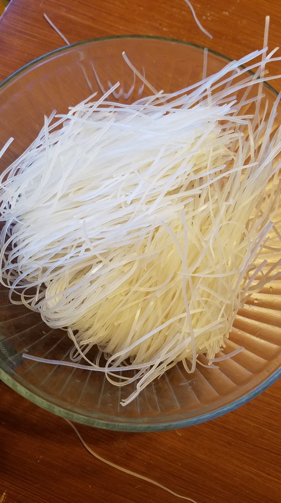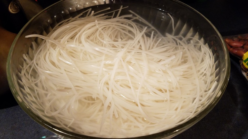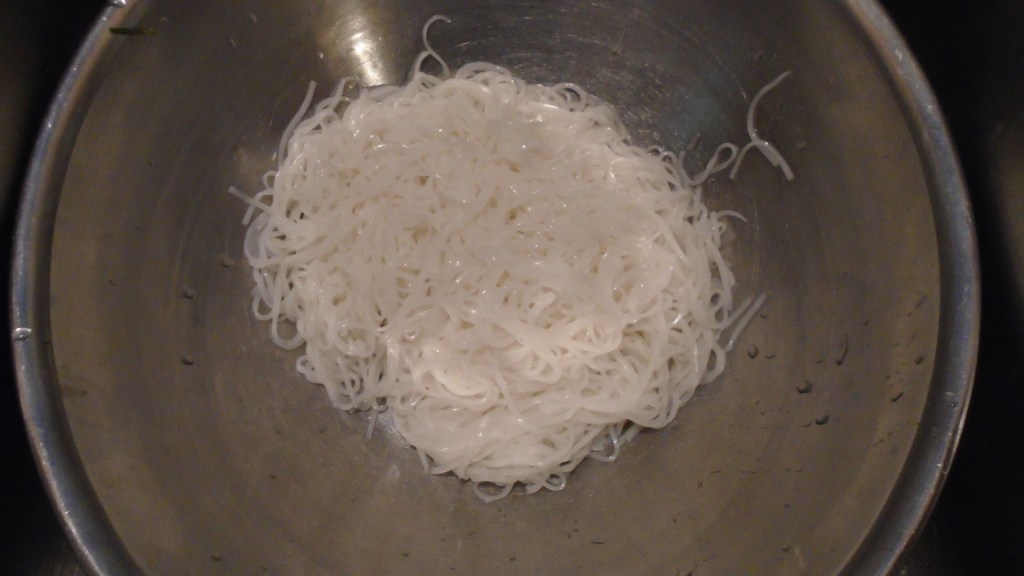 I followed the instructions on the package of noodles and soaked them in cold water for 20 to 30 minutes. I pulled the noodles out and heated the water to a boil and added the noodles back in for about 10 minutes, until they just became tender. I set the noodles aside.