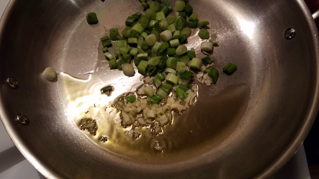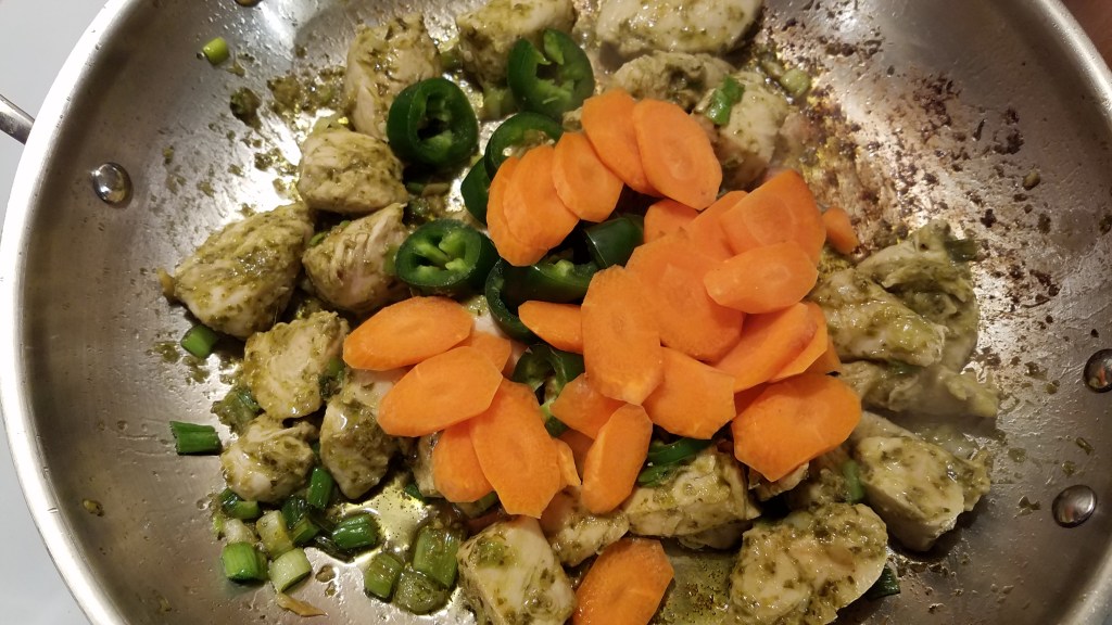 Now that the noodles and chicken were ready, I heated the wok and I added the julienned onions and stirred for a minute, then I added the mashed garlic and stirred another minute, and finally add the Thai chilies. After a minute more of stirring I removed the onion, garlic, and chilies and set aside.