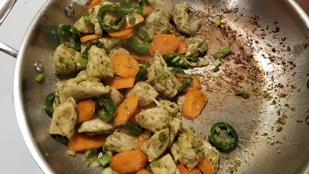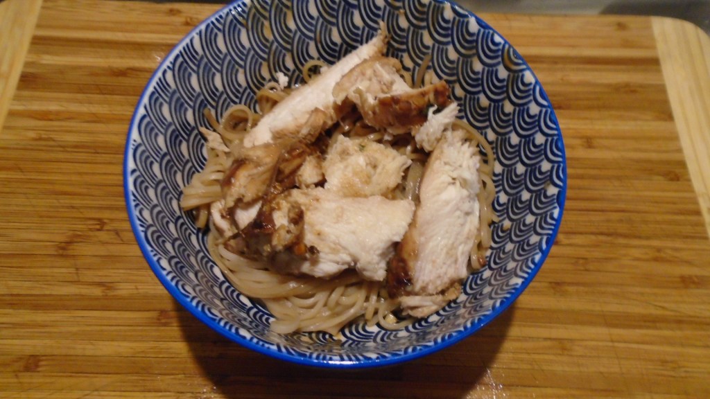 I added the noodles to a serving bowl and topped it with the cooked chicken. I poured the contents of wok over the serving bowl and dinner was served.