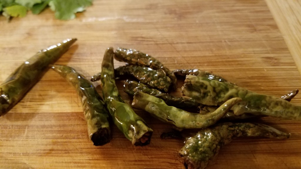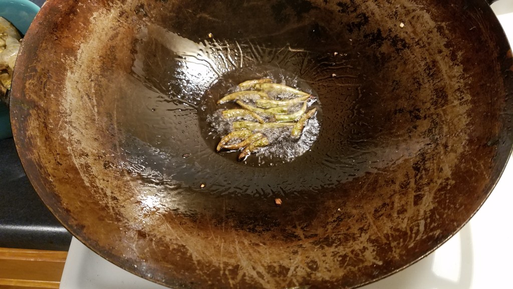 Heat a wok at high heat. Add the cooking oil and the chilies. Sear the chilies for about one minute, or until the outer skins begin to blister. Remove the chiles and set aside. I put them in a small dish to serve at the table.