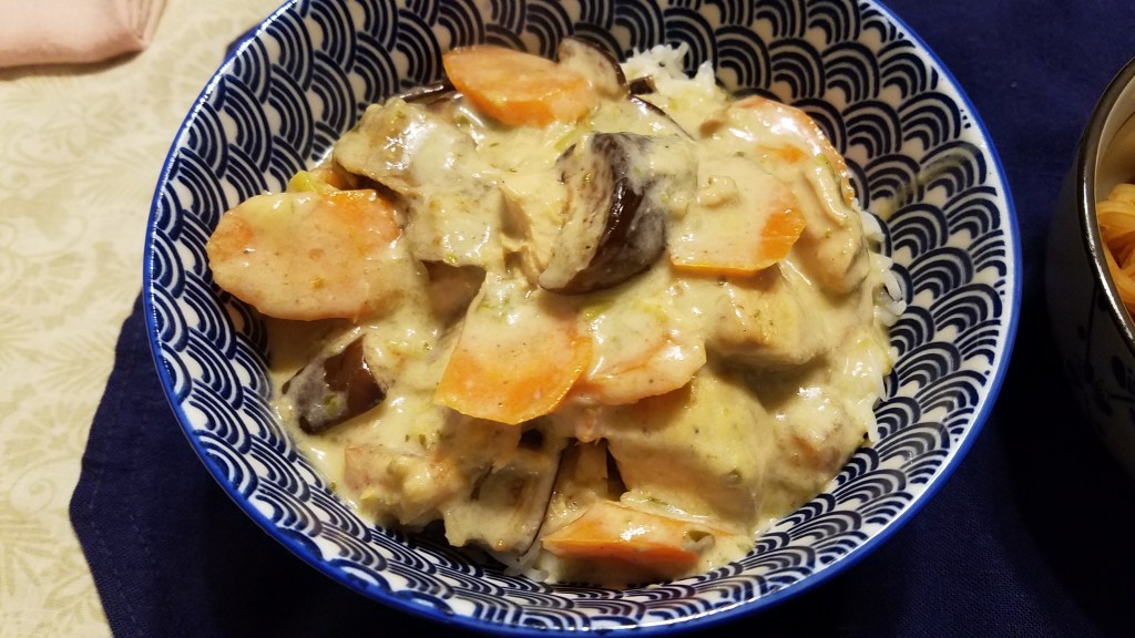 Remove to a serving bowl and keep warm until serving time. Serve in bowls, over basmati rice.