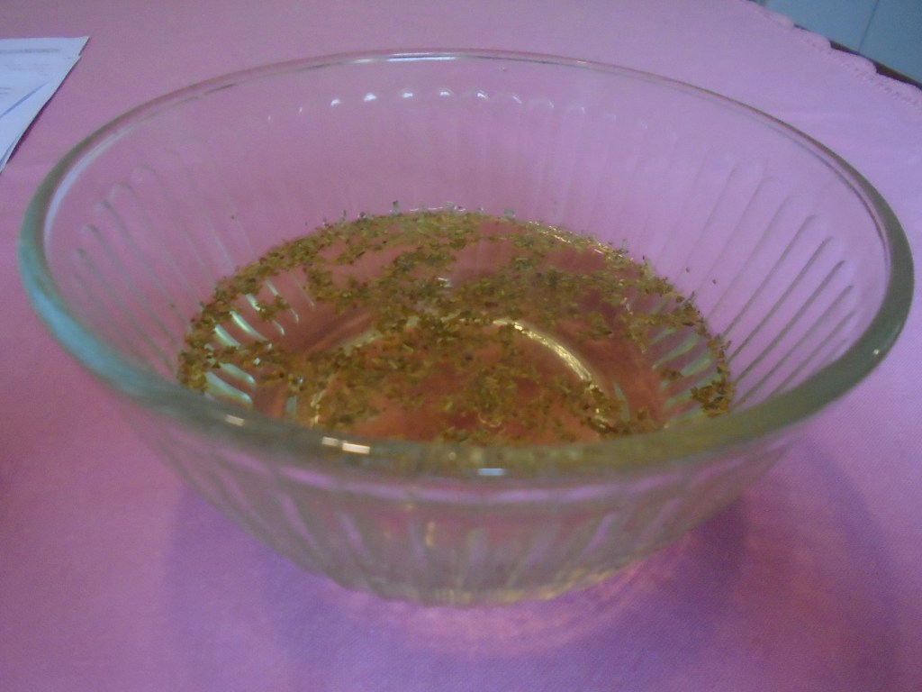 Fill a small bowl with 1 ½ cups of boiling water. Add the rosemary and sugar. When the water has reached room temperature, remove the rosemary and reserve for later.