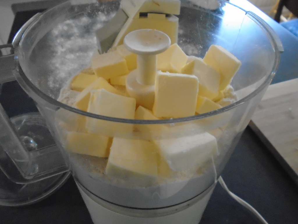 Since hands are warm, and warmth is a pastry killer, I added the flour, salt and butter to a food processor. I pulsed the food processor several times until the flour and butter combined to make a grainy mixture.
