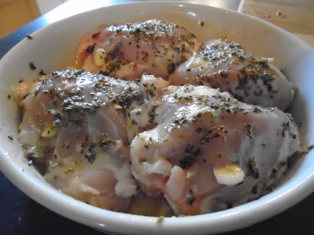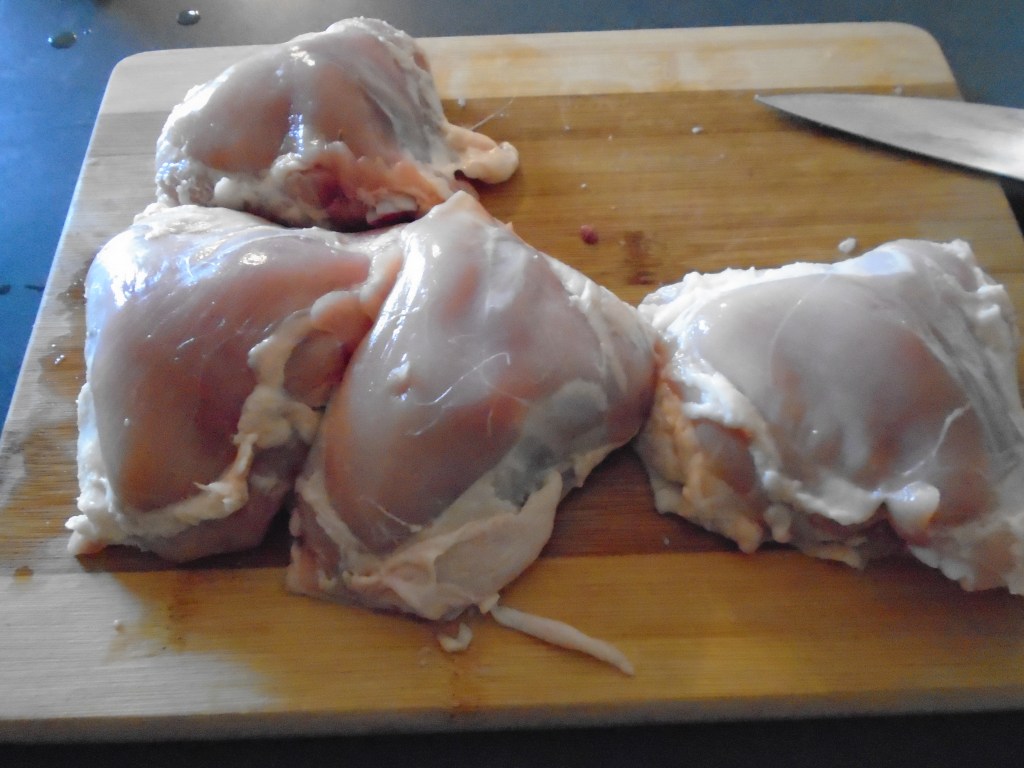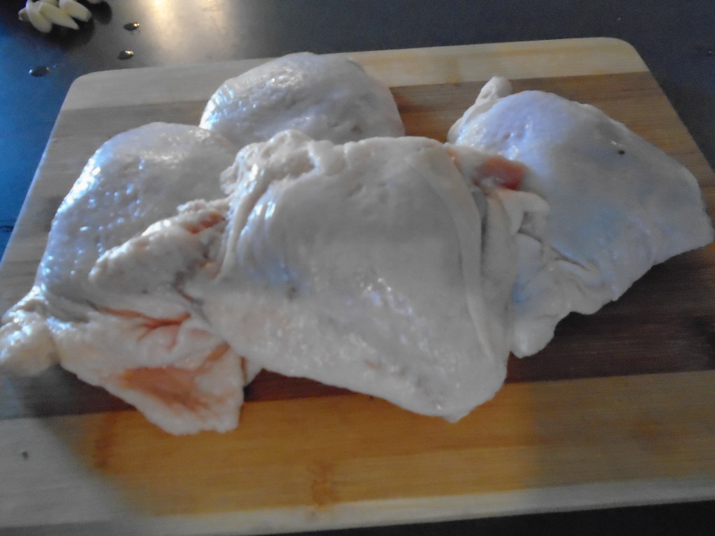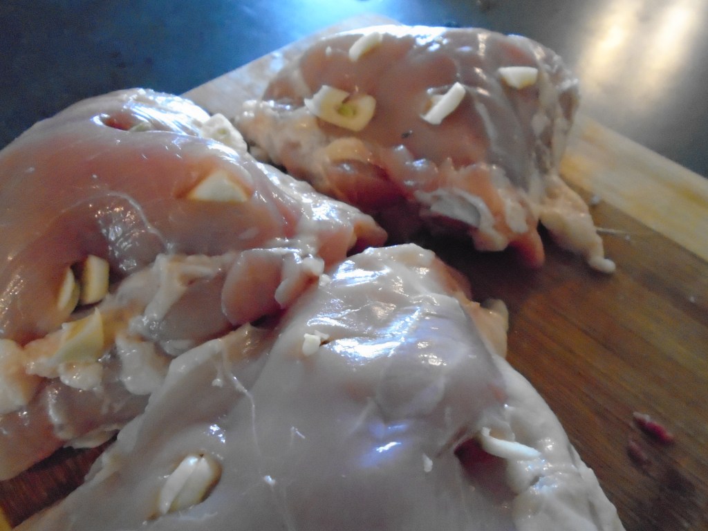 Remove the skin from the chicken thighs and discard. Using a small, sharp knife, make several incisions in the chicken and insert the slices of garlic.