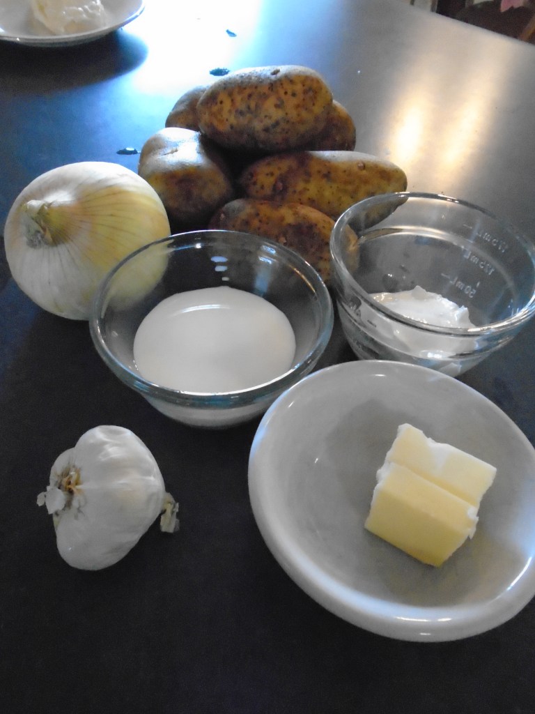 Using a hand-held mixer, blend the potatoes, including the potato skins, with the butter, sour cream, milk and roasted garlic. Store in warm place.