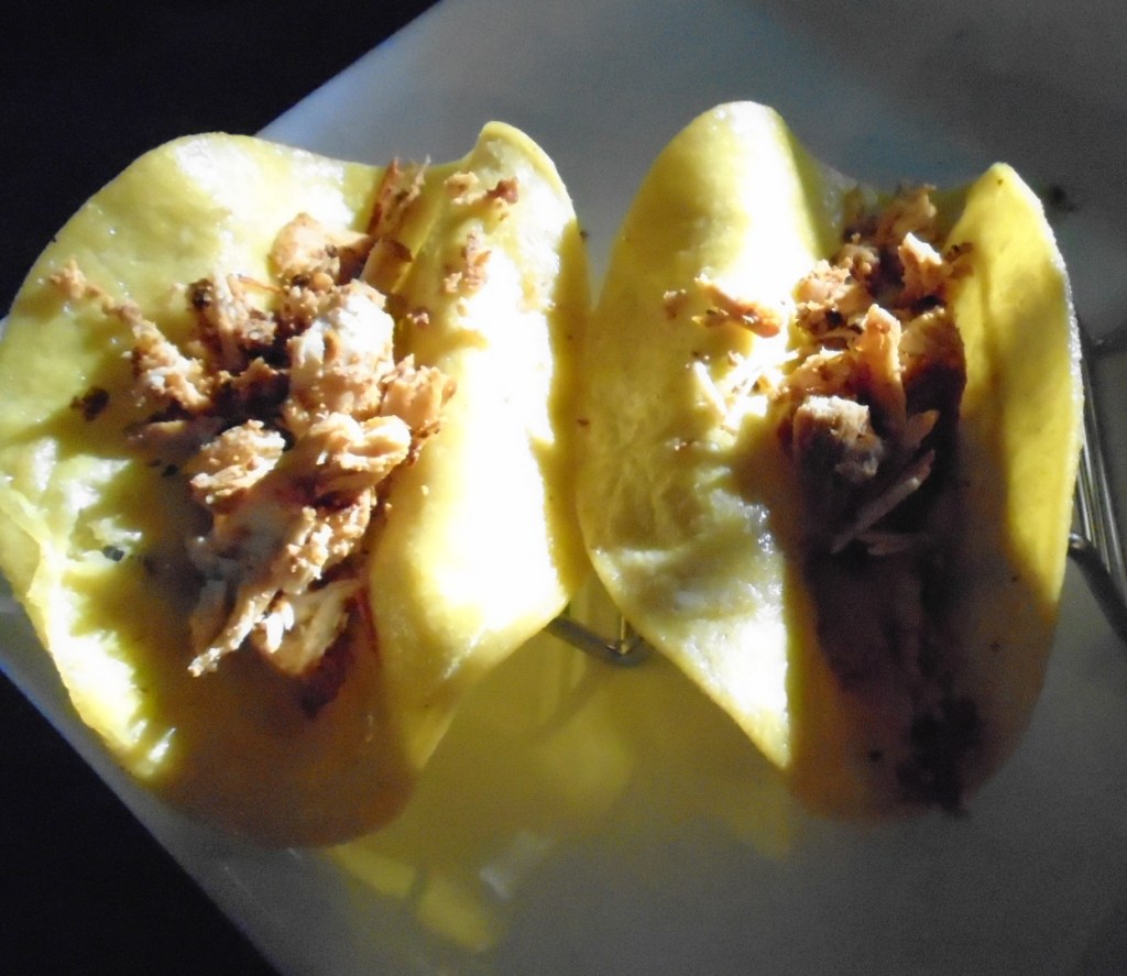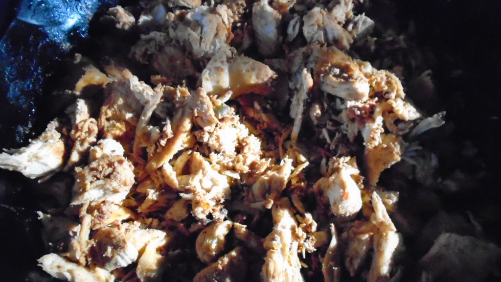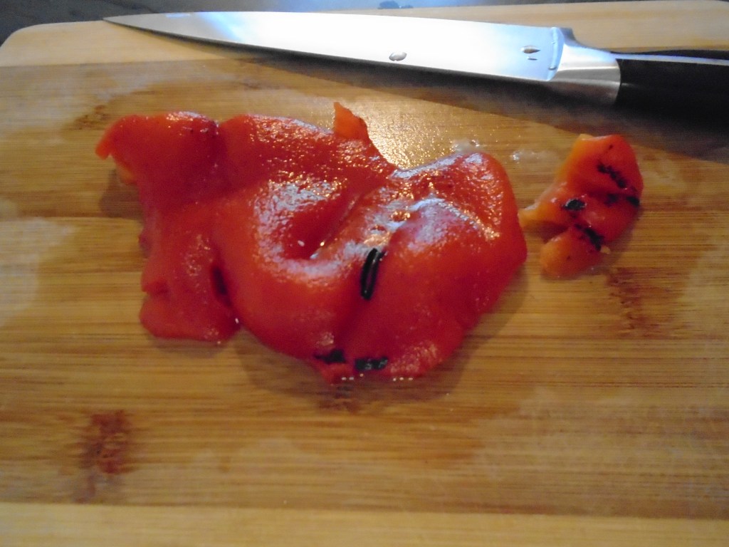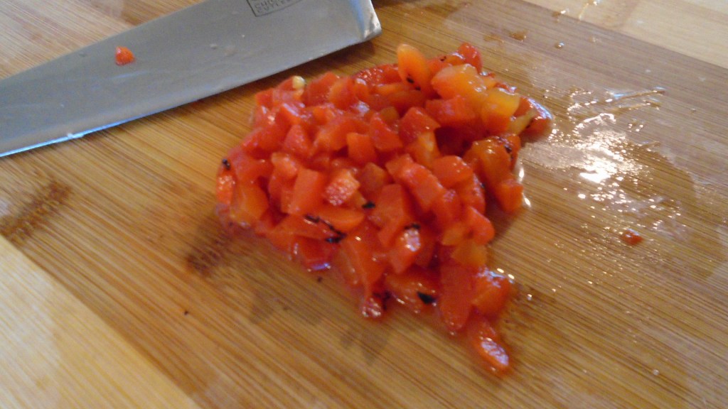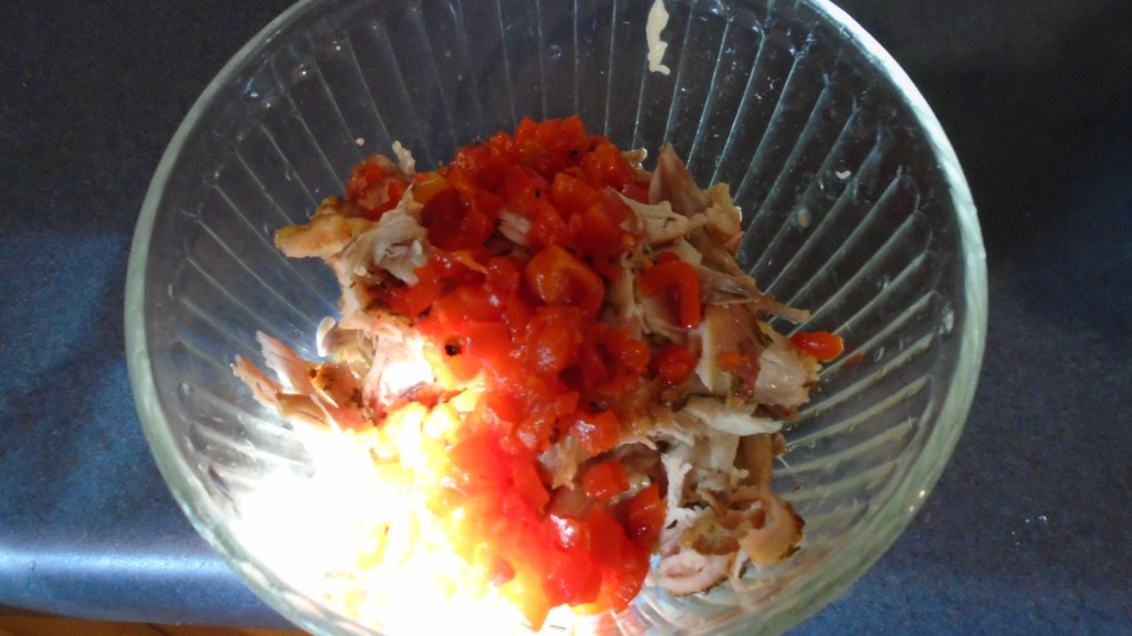 Dice the roasted peppers and add to the shredded chicken. Add the mushrooms to the chicken and mix to incorporate. Set aside.
