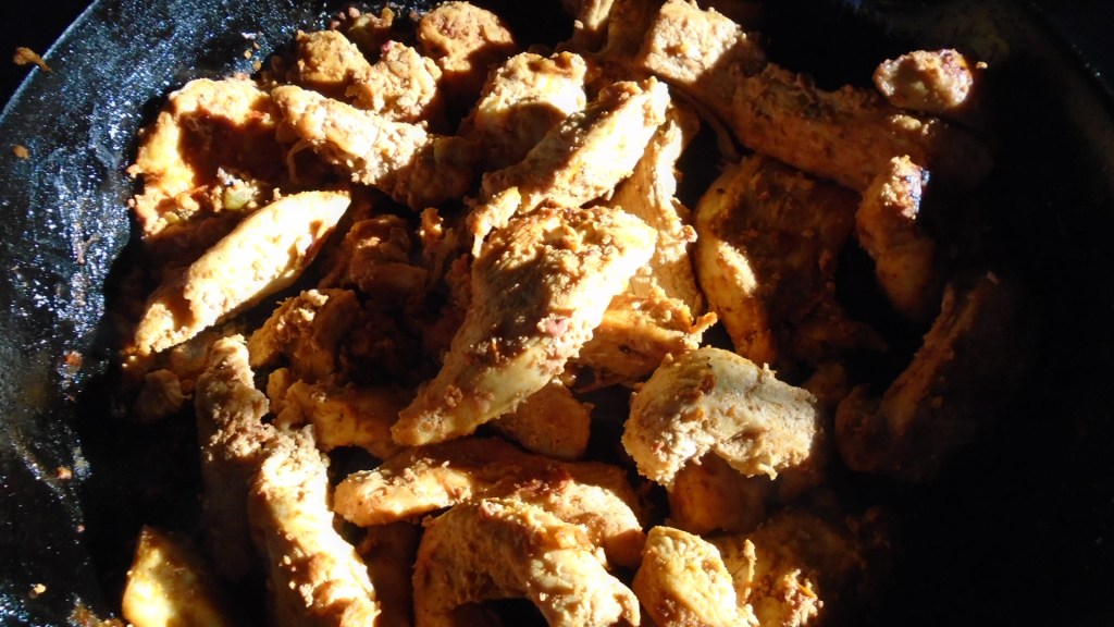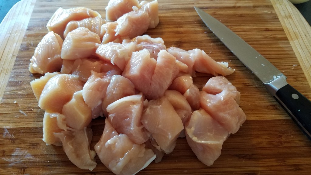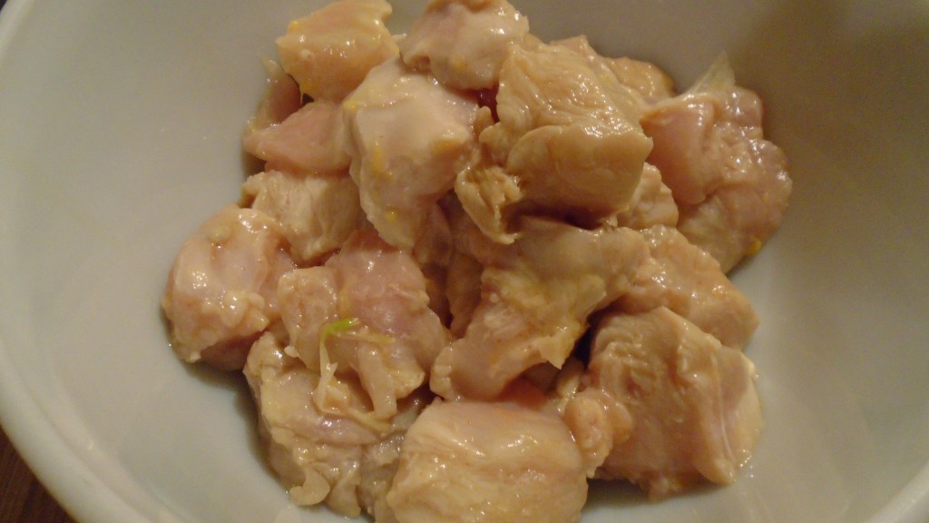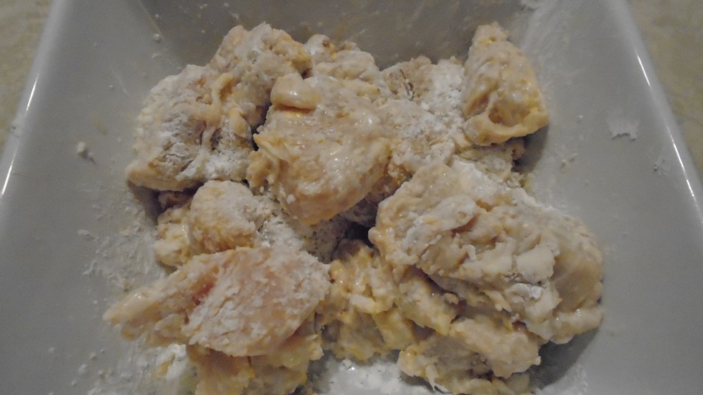 While the noodles were soaking, I cut chicken breast meat into bite sized pieces and added them to a mixture of flour and cornstarch (about 4 to 1 ratio, flour to cornstarch). I tossed the chicken pieces until they were fully coated.