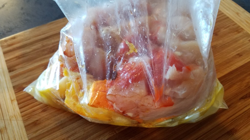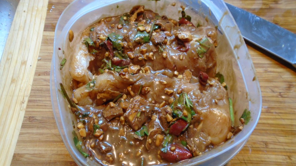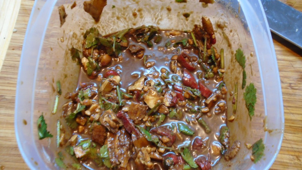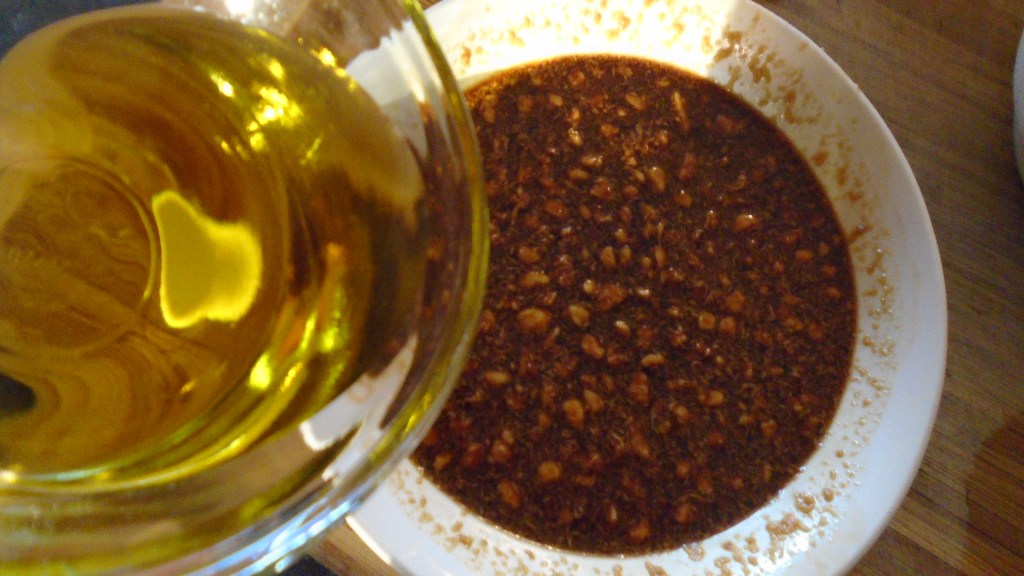 Combine the marinade ingredients in a bowl and mash with a spoon. Crushing the ingredients is an important step because it releases the oils and flavors and produces a very potent marinade!