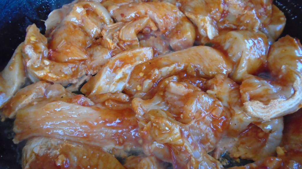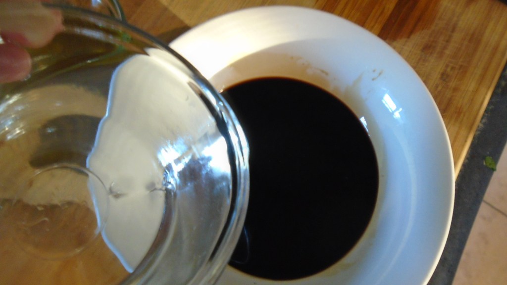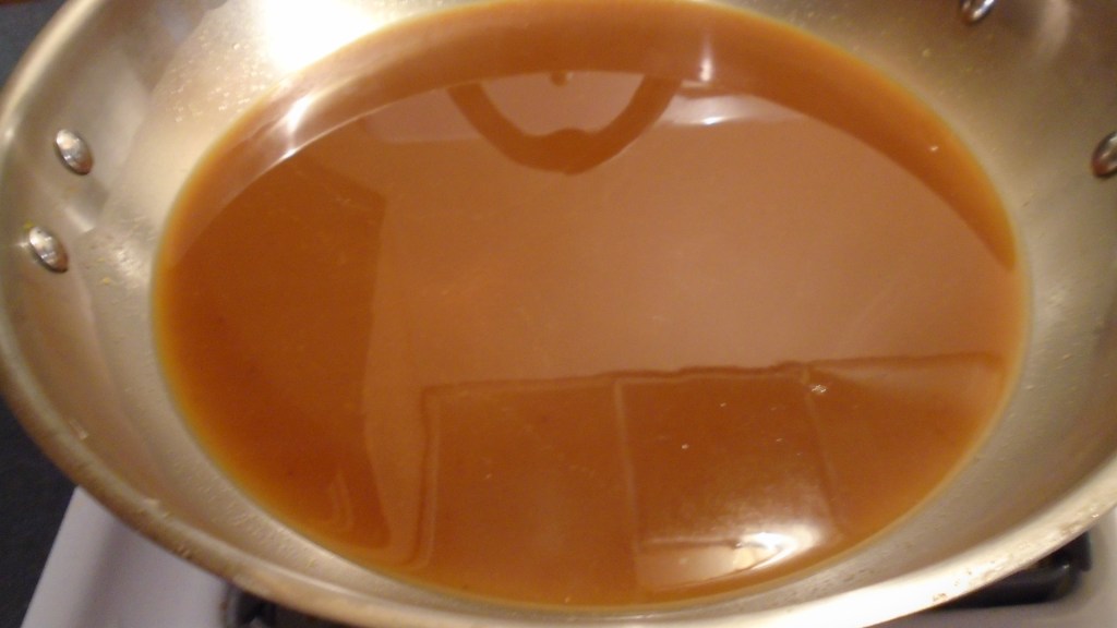 I prepared a sauce by combining chicken stock, dark soy sauce, soy sauce, oyster sauce, sugar, and vinegar. As I mentioned previously, I estimated the amounts, but this is probably close…