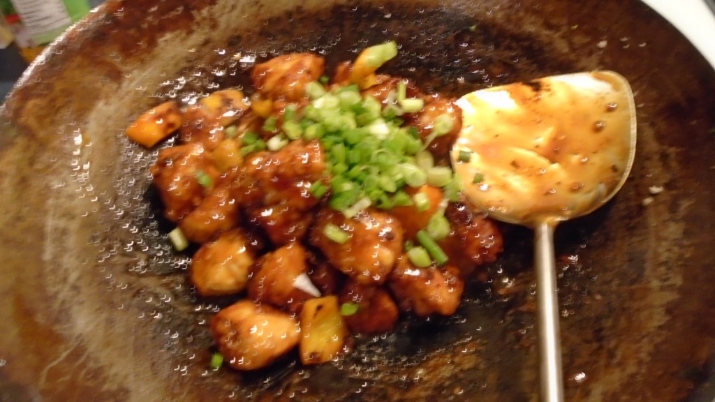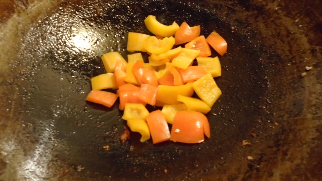 I double-fried the chicken in the wok, which is to say, I fried the chicken and then pulled it out for a minute and then put it back into the wok to finish with a crisp fry. I set the chicken aside and removed all but about 2 tablespoons of oil.