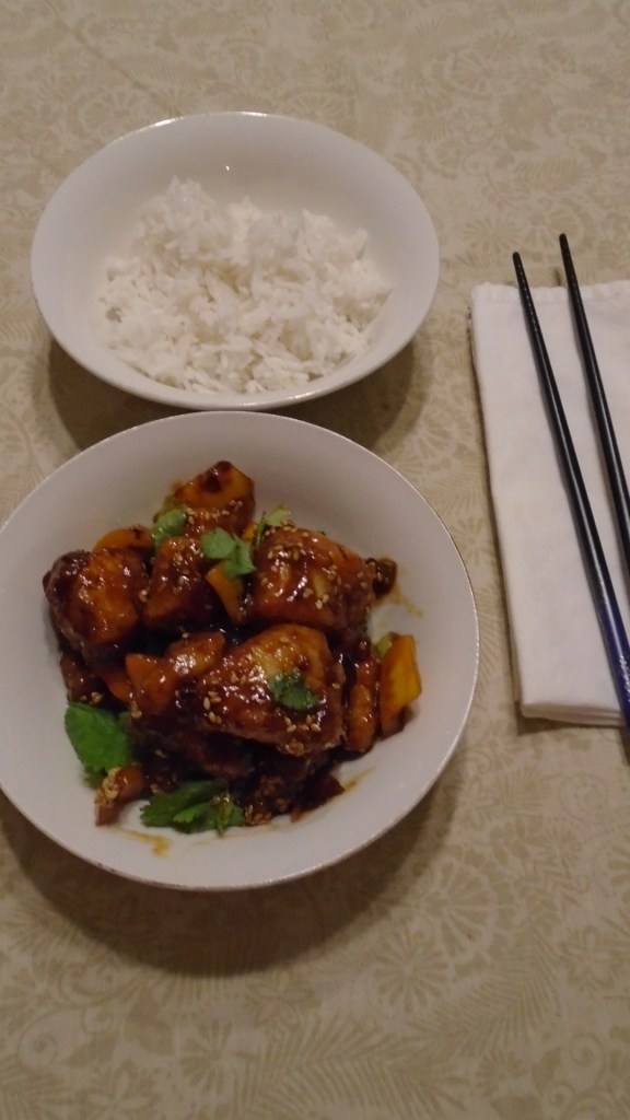 I pulled out a bit of the sauce from the wok and added some cornstarch to make a slurry. I added the slurry back into the work and whisked for a minute, until the sauce thickened a little.