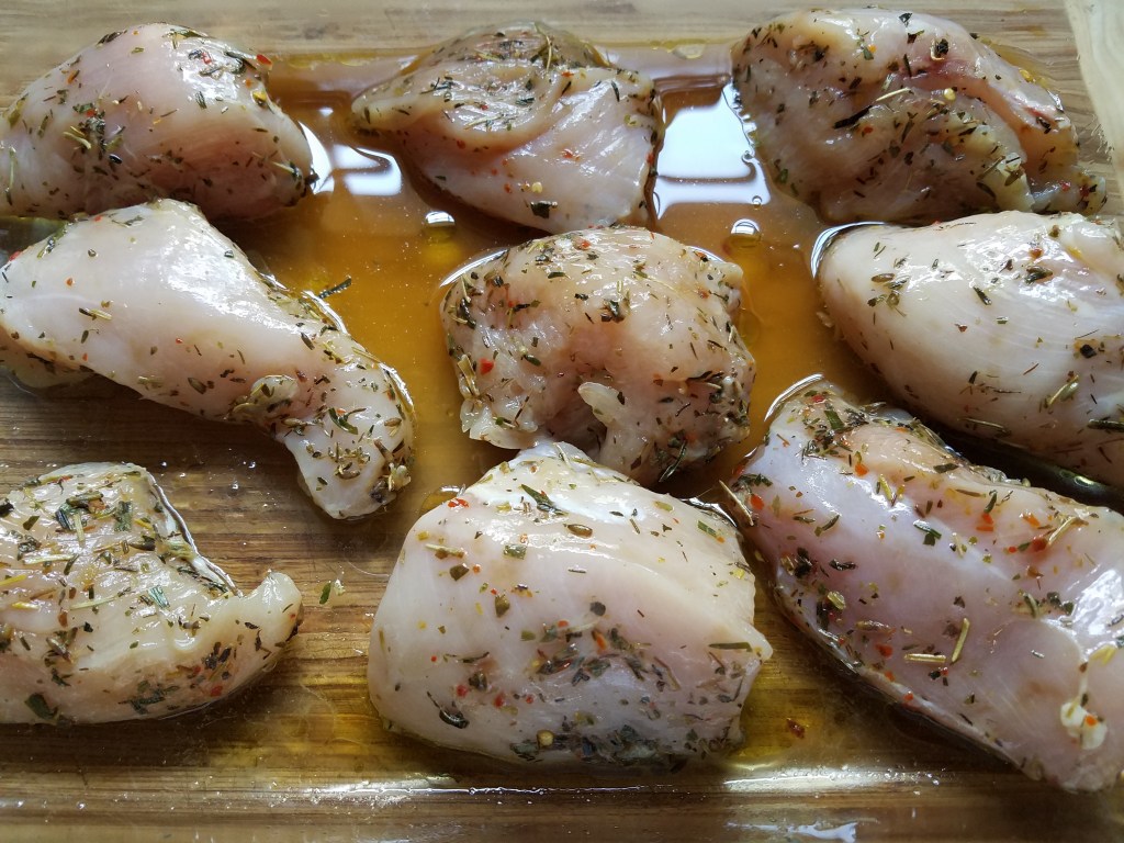 Add chicken breasts to a clean work surface. Pound the chicken to about ½” thick with the broad side of a meat cleaver or mallet.
