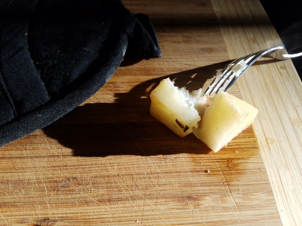 Wash and scrub the potatoes. Put the potatoes in a large pot and cover with water. Cover the pot with a lid and boil the potatoes at low heat for about one hour, or until the potatoes can be pierced easily with a fork.