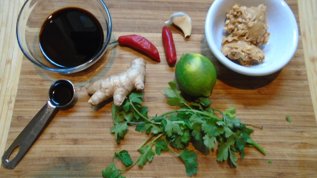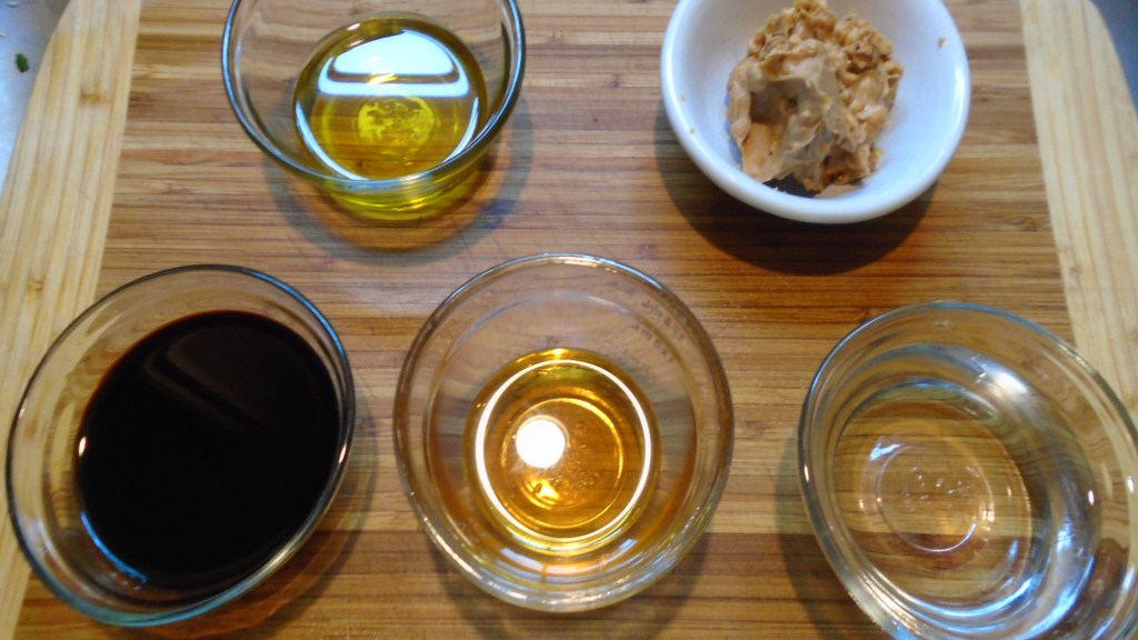 Add the dark soy sauce and honey to a mixing bowl. Add warm water and mix thoroughly. Add the peanut butter and mix to combine. Drizzle the oil into the mixture and whisk. Add lime juice and minced garlic and mix. Set aside.