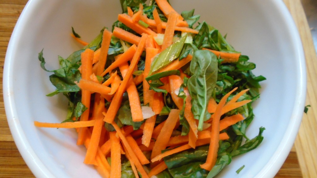 My first step was to make the puff pastry for the chicken dish. From there I prepped much of the rest of the meal in advance and kept it cool until nearly service time. I finished by roasting the vegetables and frying some matchstick onions.
