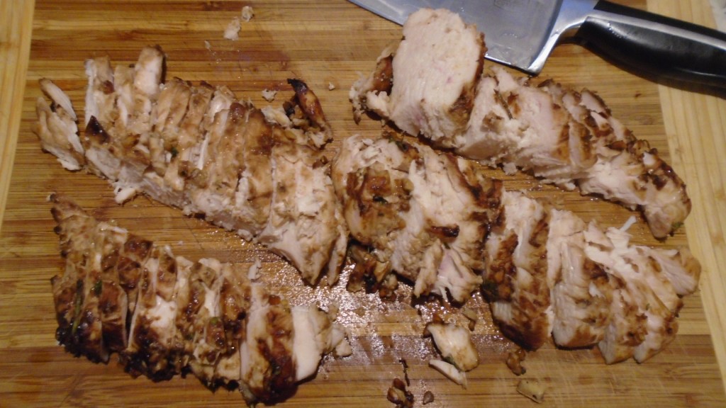 While the chicken is on the grill, go back to the kitchen to chop some vegetables.