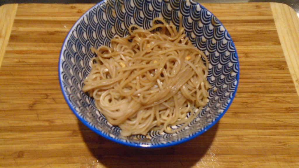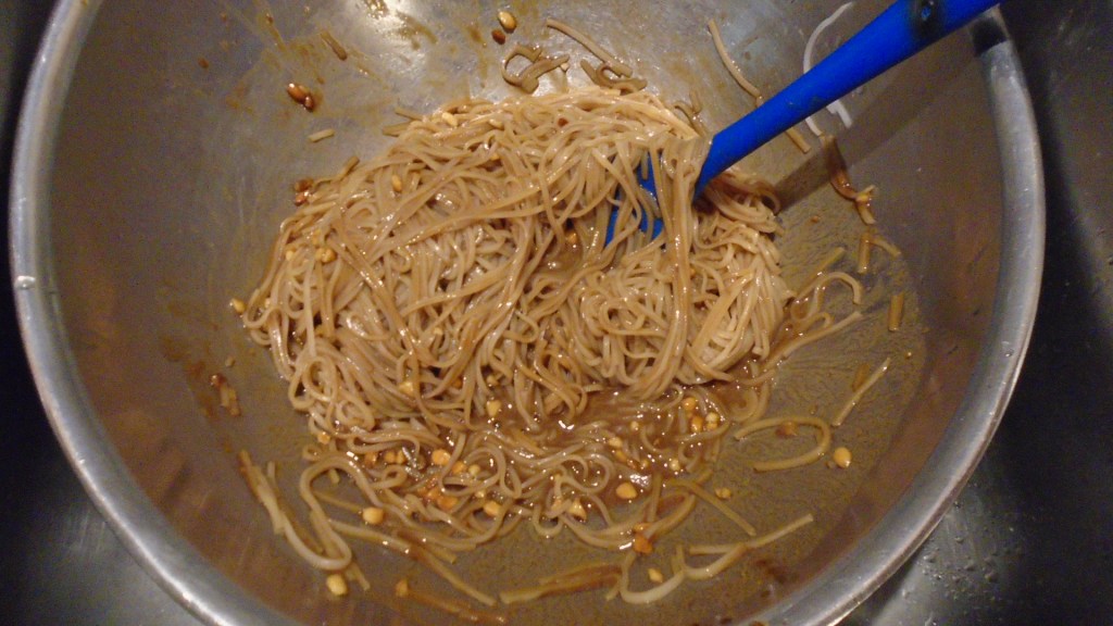 I added the prepared sauce and simmered it at medium heat for a minute and then added the cooked noodles and swirled them in the wok for a minute so that the noodles could absorb some of the sauce, and then I removed the noodles and set them aside.