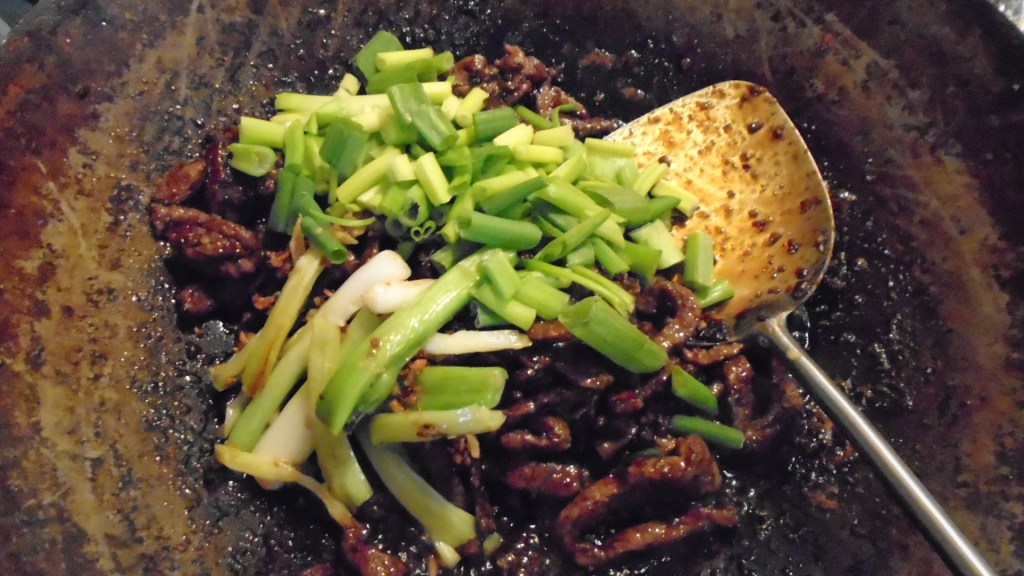 In a large skillet, add the rendered beef fat. Vegetable oil may be substituted. Set heat to medium and add the onions and chiles.