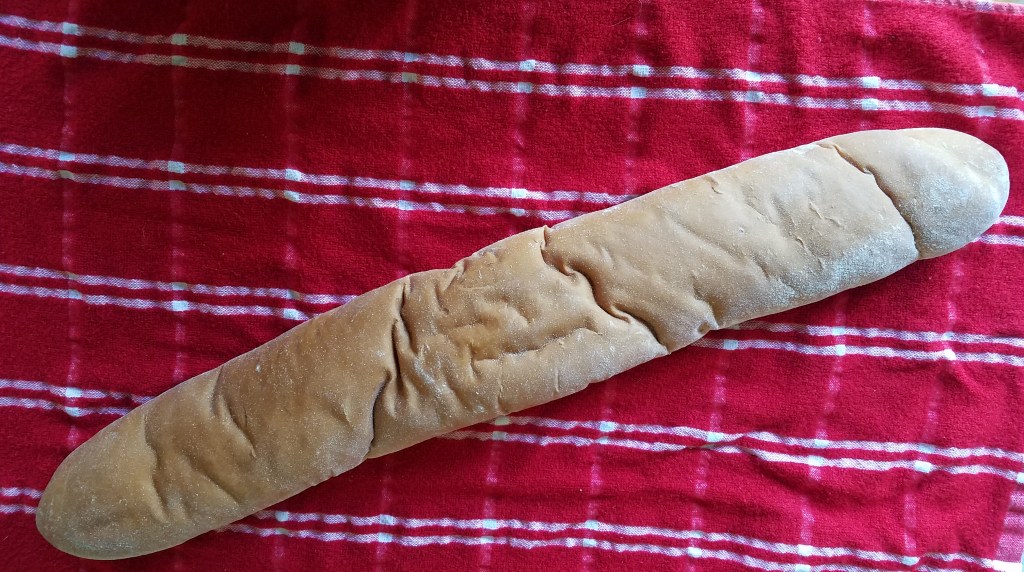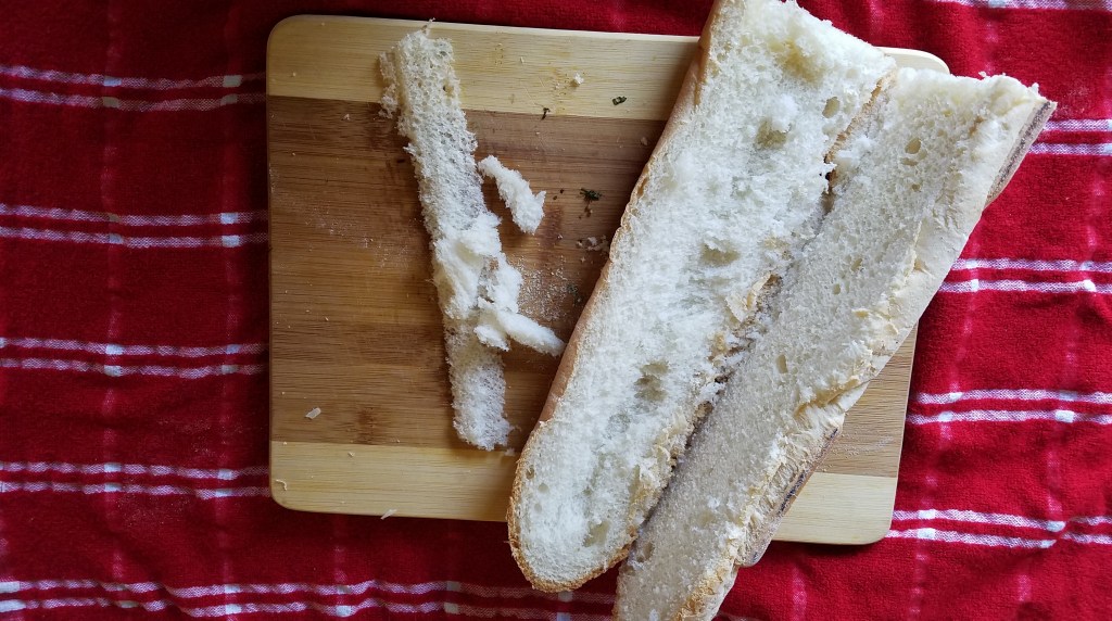 Cut the loaf of bread into 1” thick slices. Lay the pieces of bread directly onto an oven rack and heat for about 15 minutes at 200°. Dry the bread but don’t toast it. Remove the dried bread from the oven and cut into 1” cubes. Toss the cubed bread in a bowl while drizzling a scant amount of olive oil. Put the croutons on a baking sheet and toast at 300° for about 15 minutes. I let mine go a bit too long in the oven and they tasted nutty. (Note of the brown hue of the croutons in the photo.)