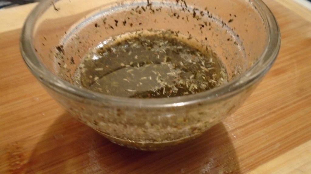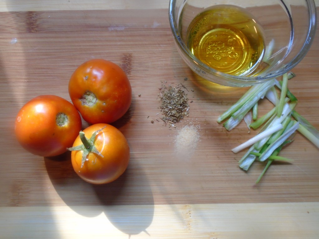 1 fresh tomato, sliced thin and marinated in olive oil and oregano for 30 minutes